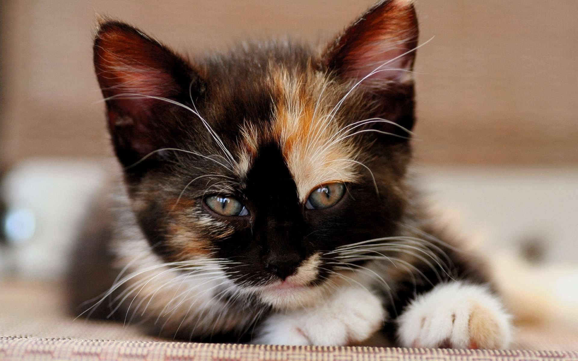 Chat tricolore couché sur le lit - fond d'écran de téléphone