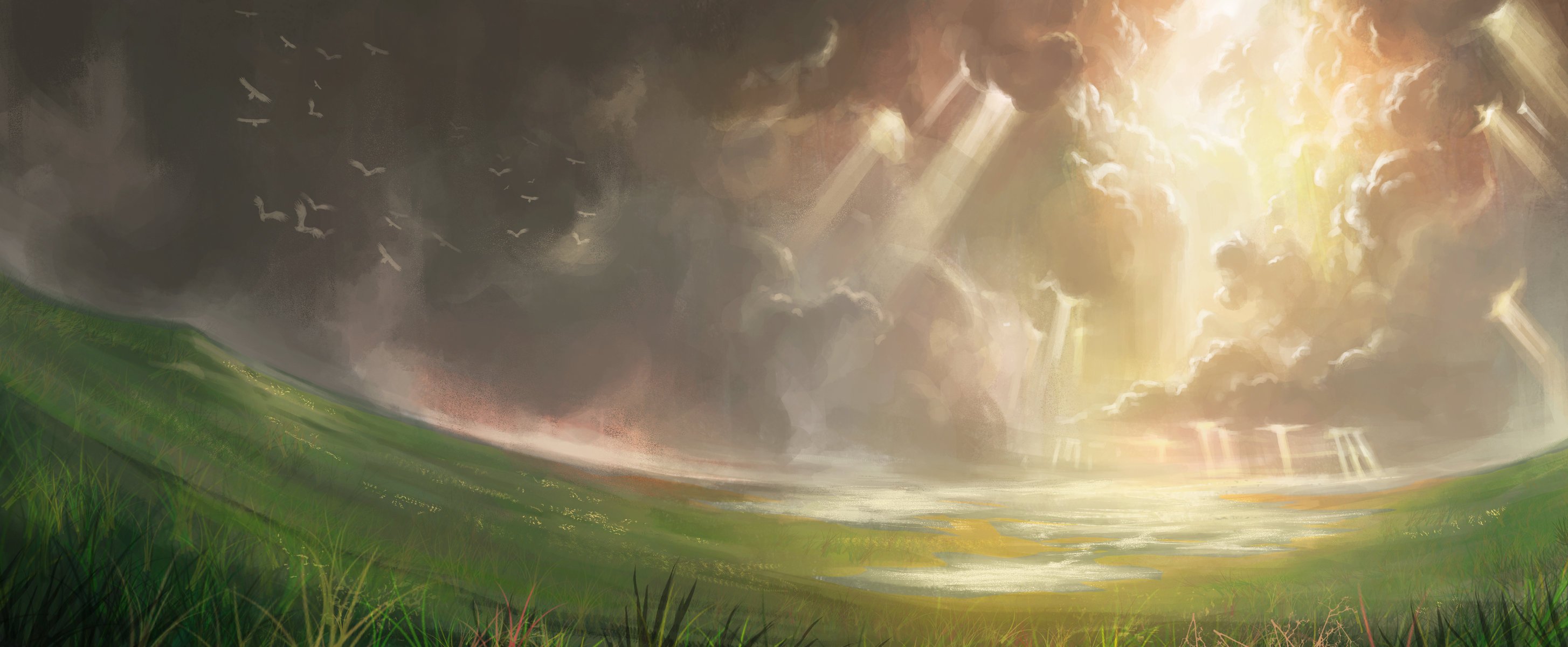 Tags:art, dessin, champ, herbe, ciel, nuages, rayons du soleil, oiseaux