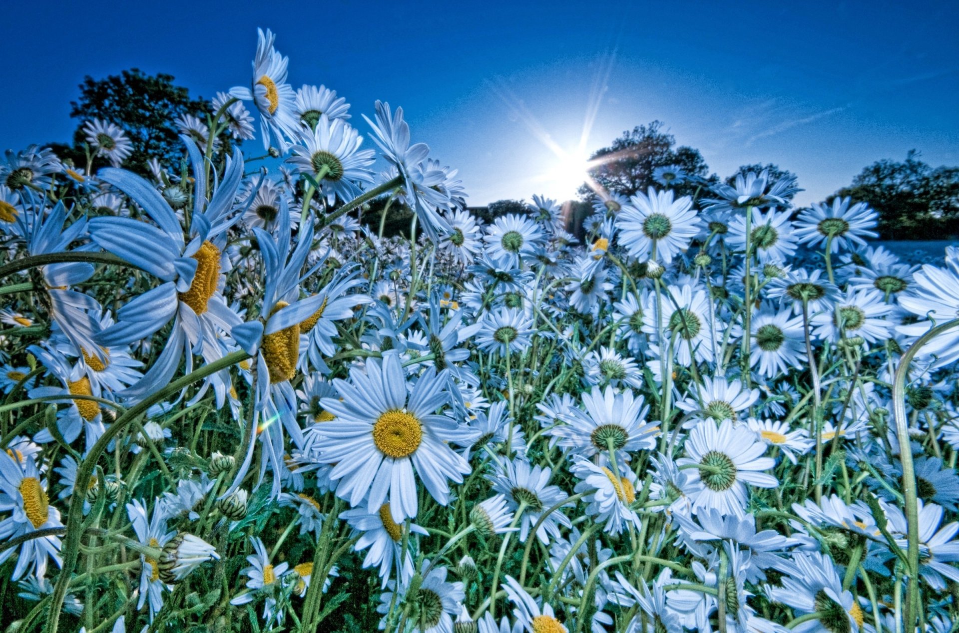 Tags:fleurs, nature, marguerites, champ, couleur bleue, soleil, ciel