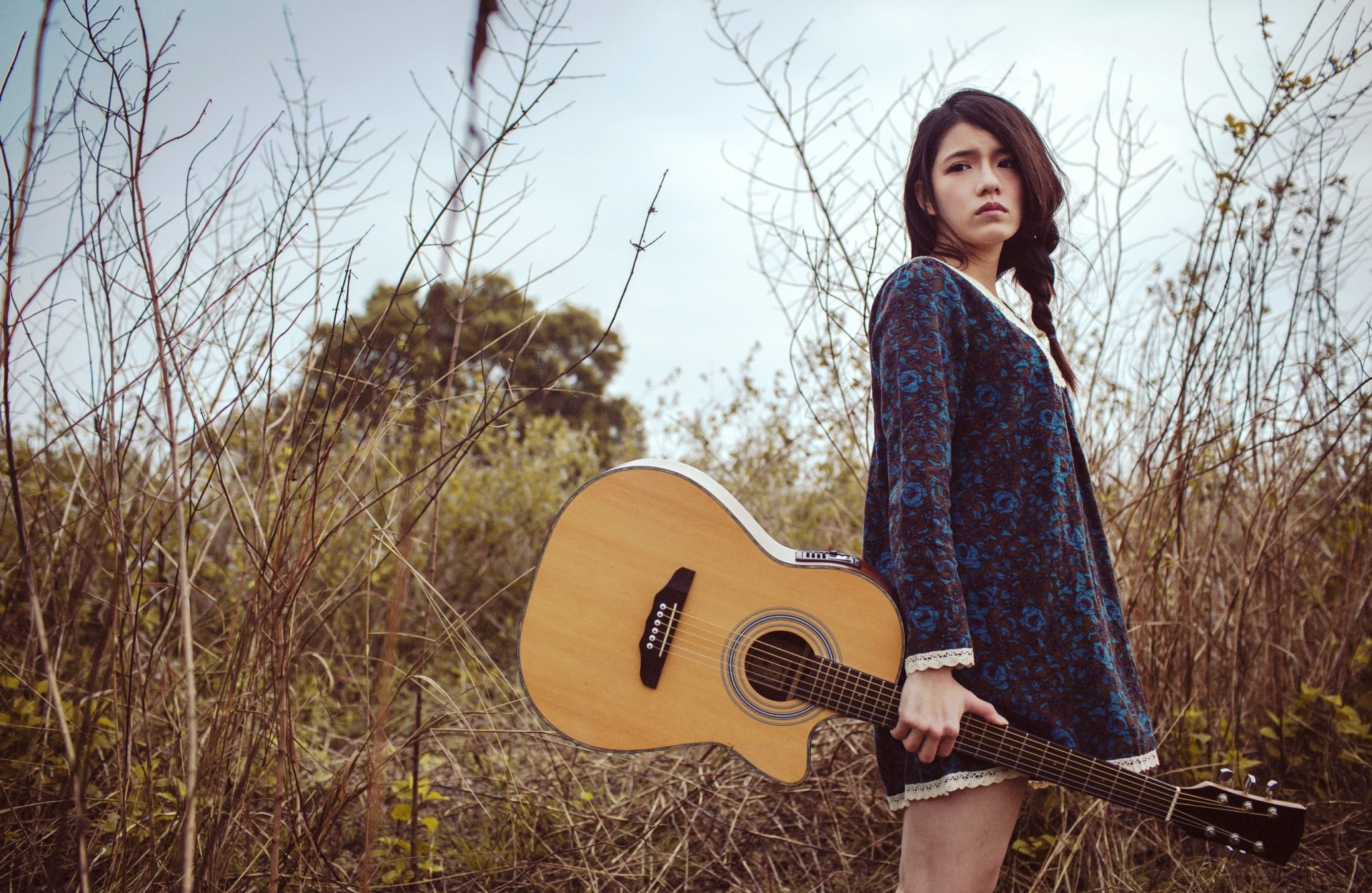Fille avec guitare sur fond de nature - fond d'écran de bureau