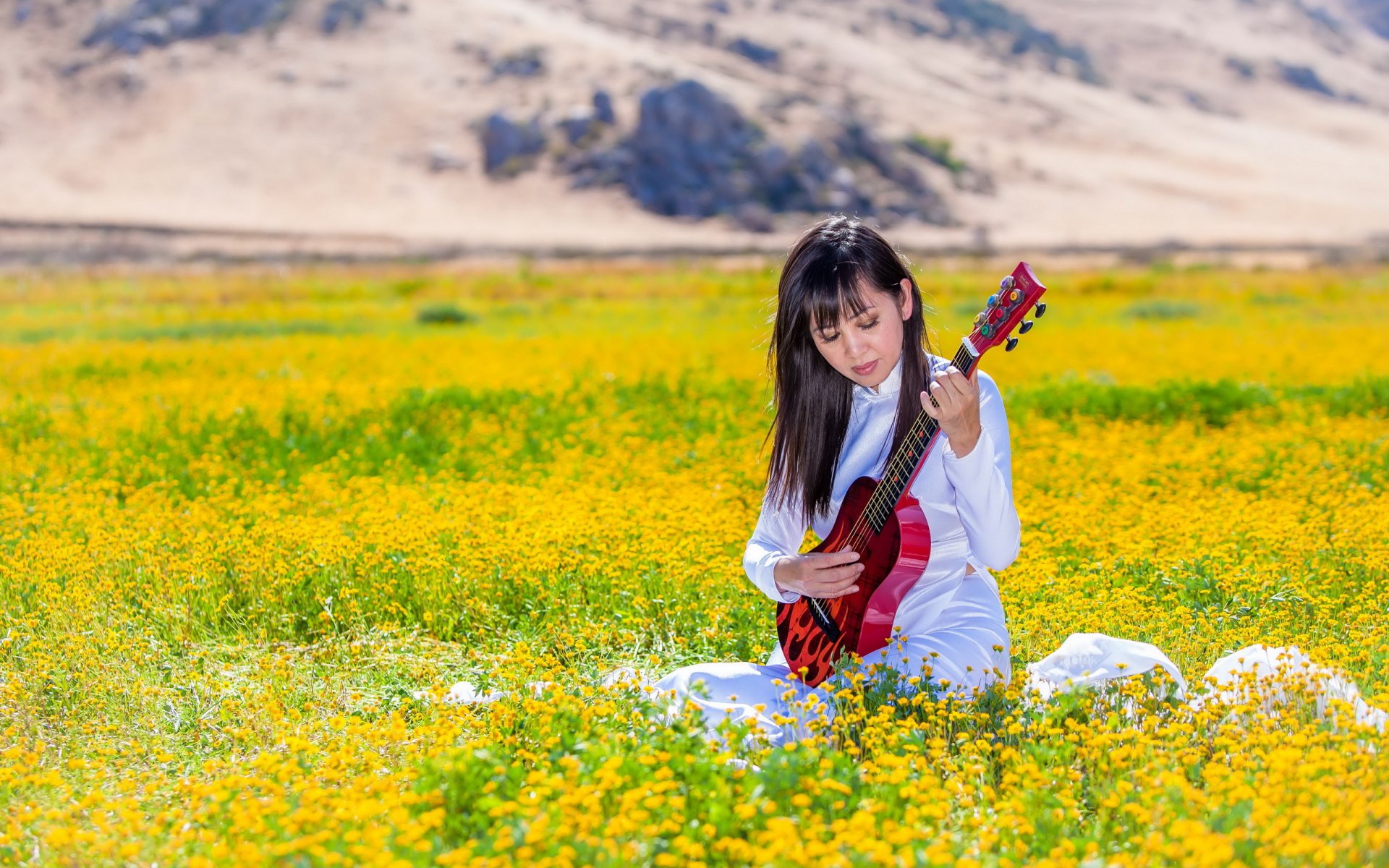 Fille avec une guitare rouge dans le champ - fond d'écran de bureau