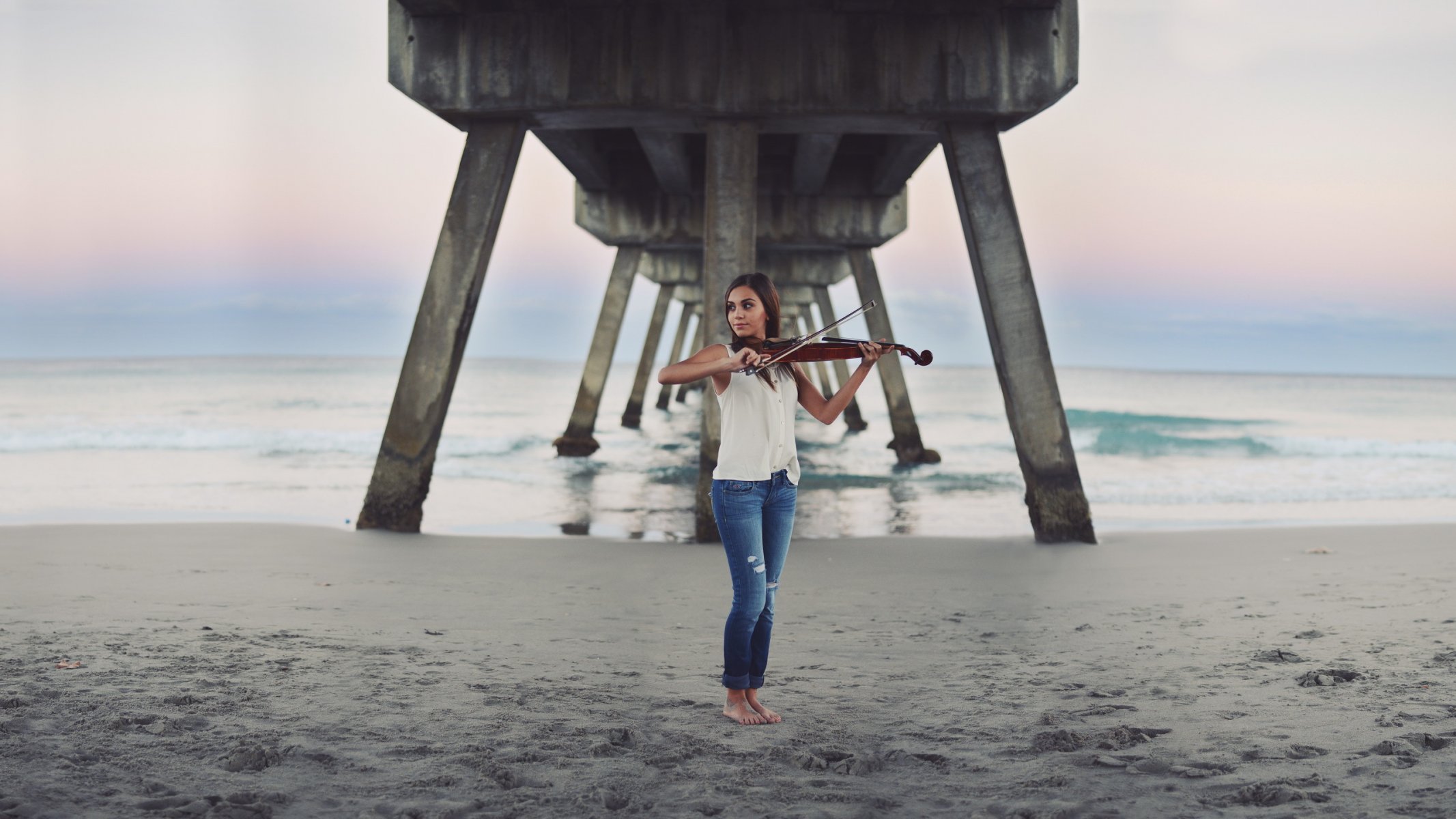 Fille au bord de la mer joue du violon - fond d'écran de téléphone