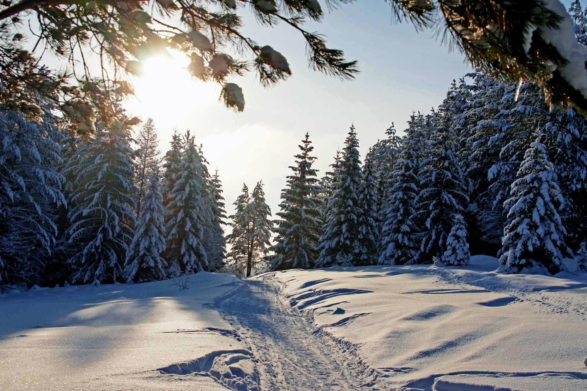 Route dans la forêt d hiver au soleil radieux - fond d'écran de bureau