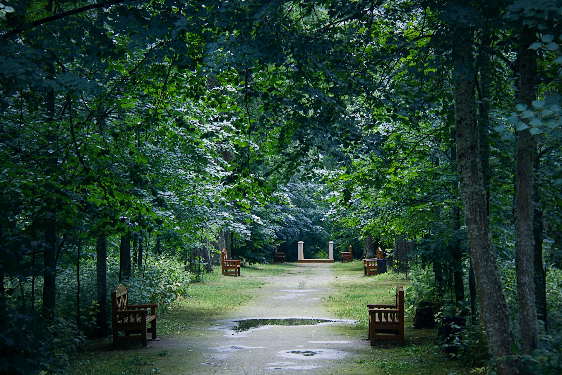 Tags:après la pluie, flaques d'eau, réflexion, bancs, parc, arbres