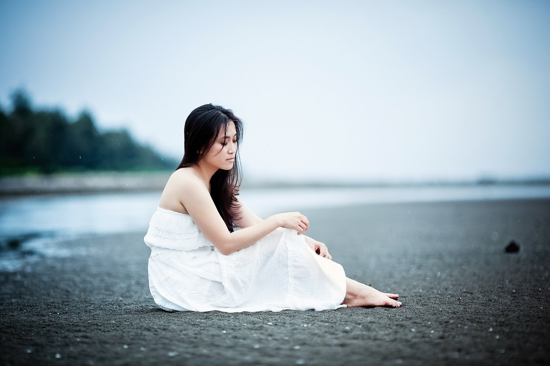 Fille en blanc est assis sur un rivage déserte - fond d'écran de téléphone