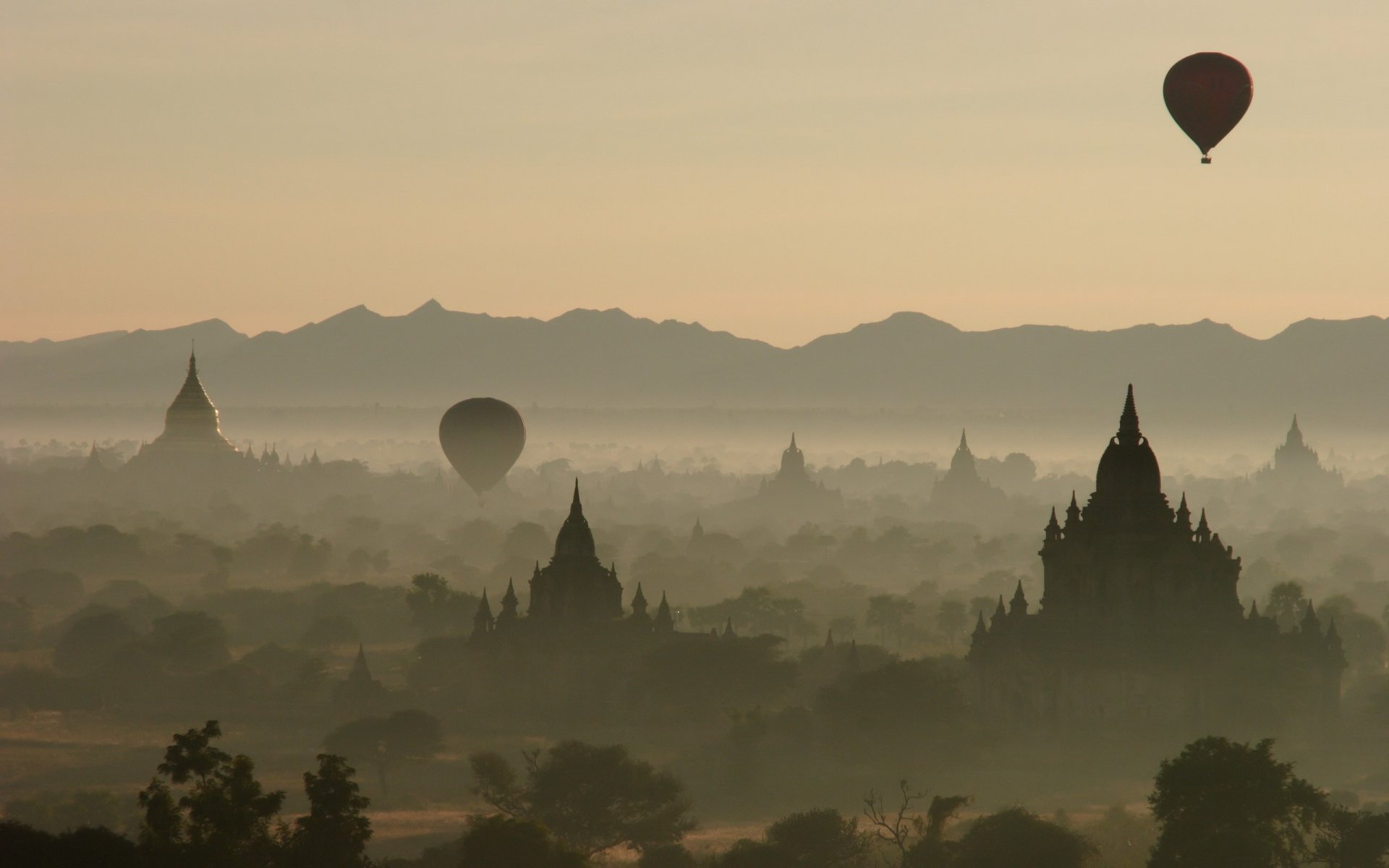 Ballon. Églises dans le brouillard - fond d'écran de bureau