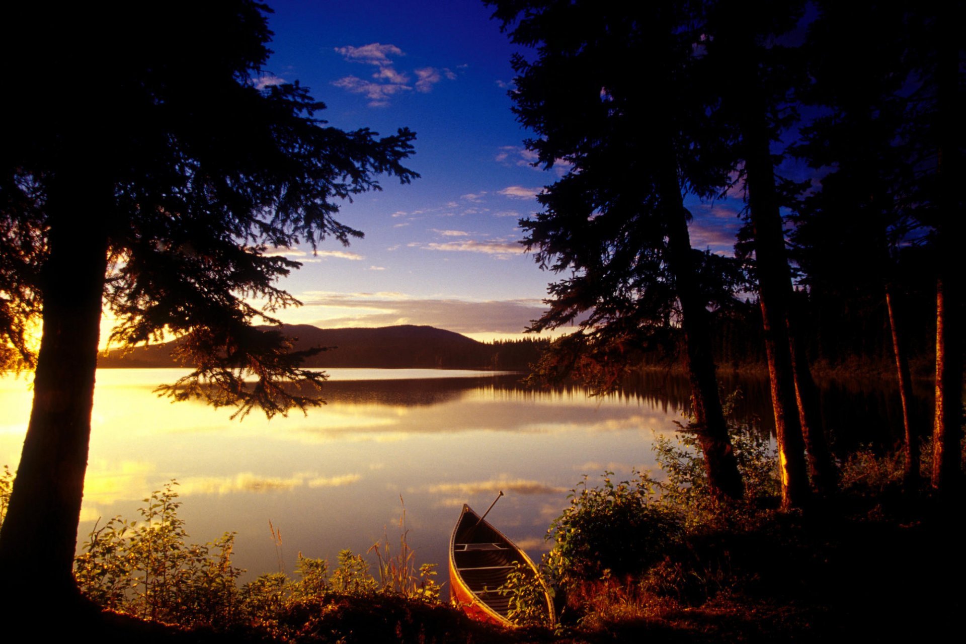 Bateau sur le lac dans les arbres et beau coucher de soleil - fond d'écran de bureau