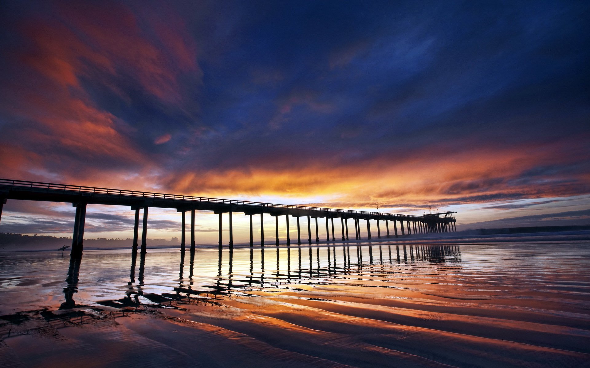 Beau coucher de soleil sur fond de pont au bord de la mer - fond d'écran de bureau