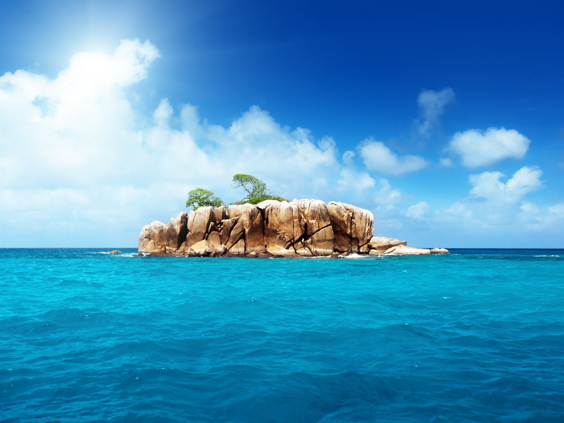 Île déserte entre ciel et eau - fond d'écran de bureau