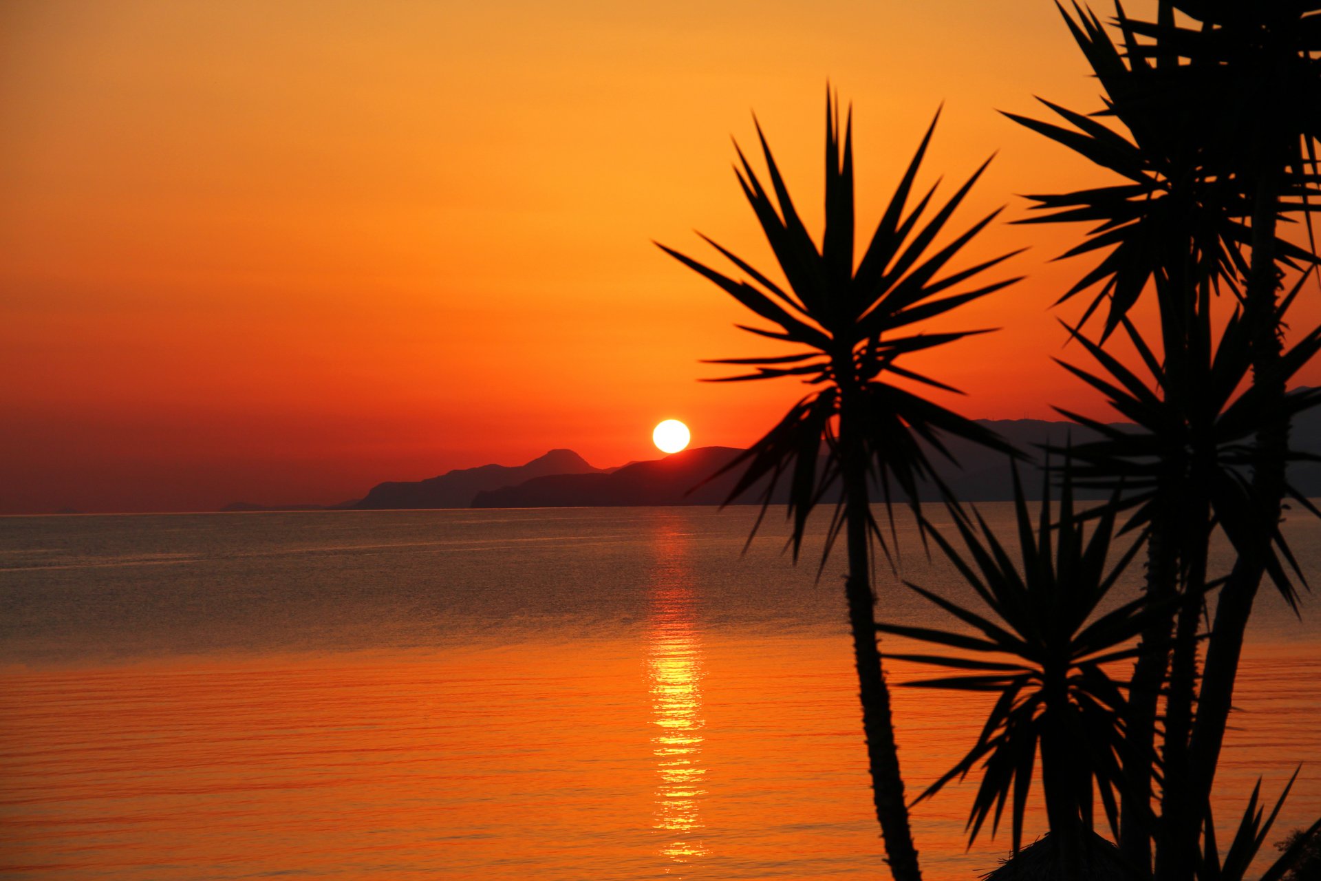 Tags:palmiers, montagnes, mer, coucher de soleil