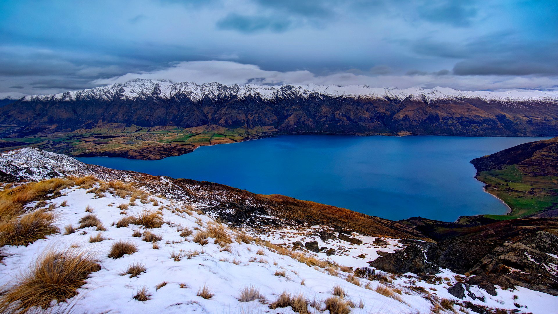 Tags:ciel, nuages, nuages, montagnes, neige, herbe, lac