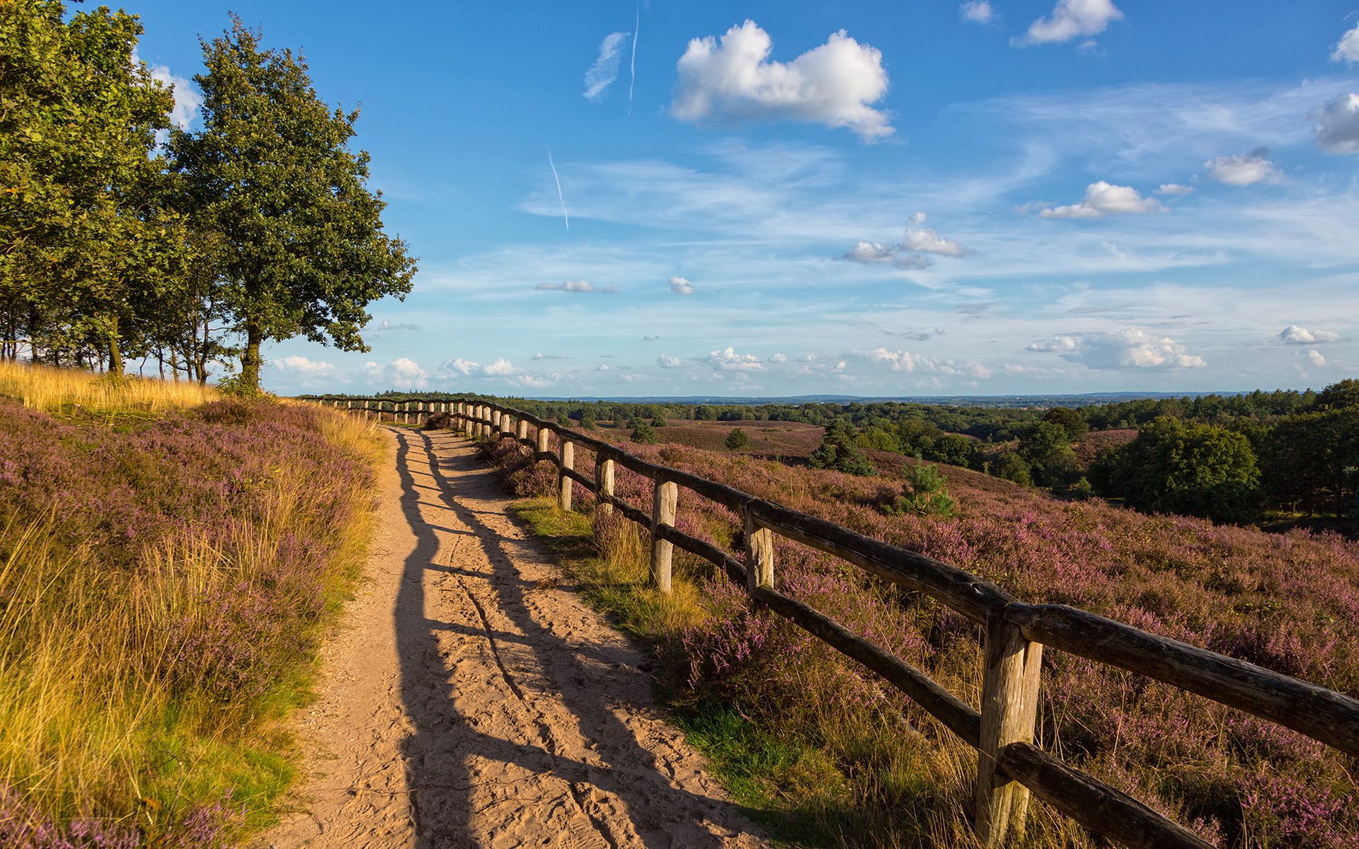 Route traversant un champ pittoresque - fond d'écran de bureau