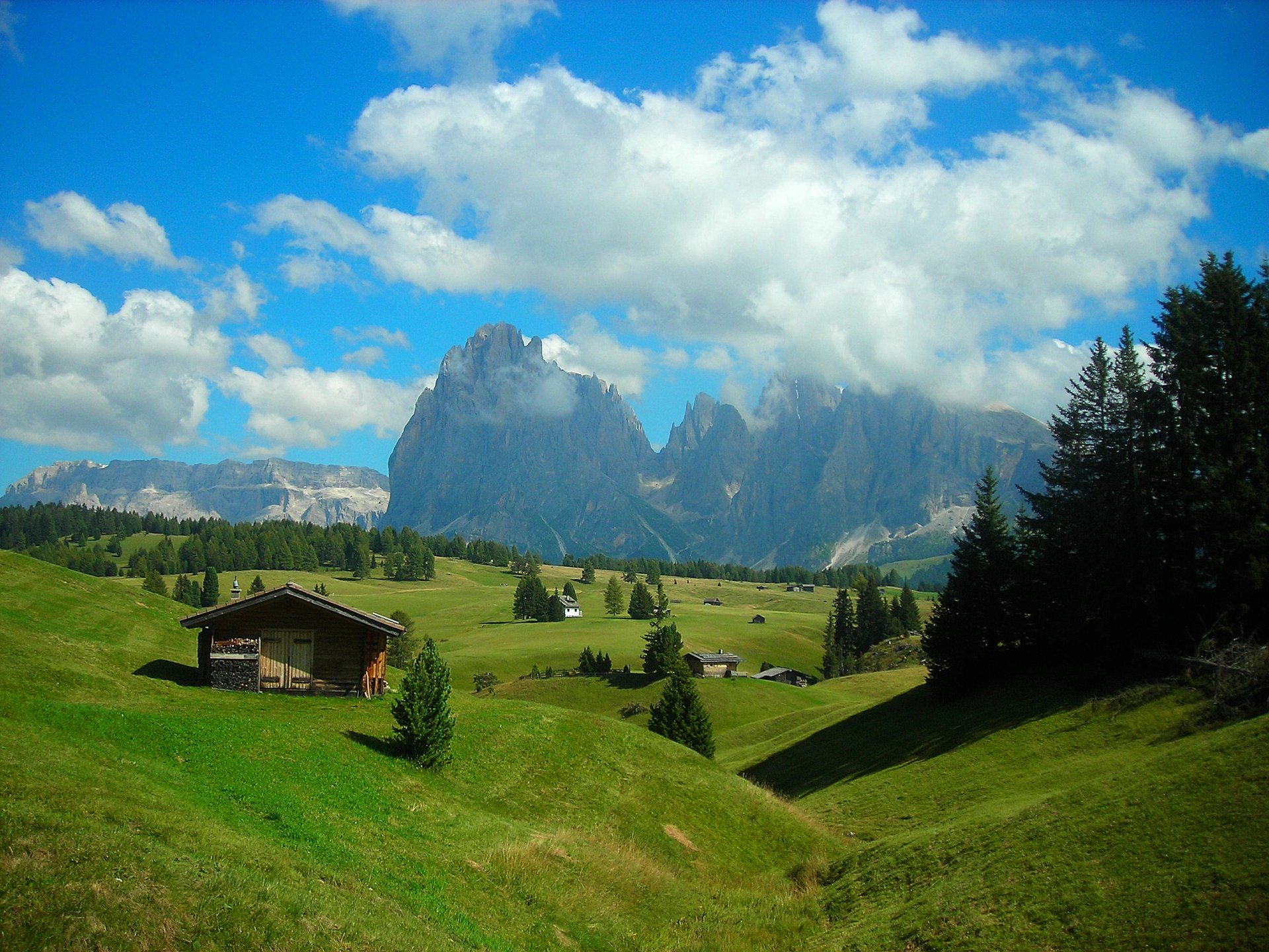 Tags:ciel, nuages, forêt, arbres, montagnes, collines, maison, herbe