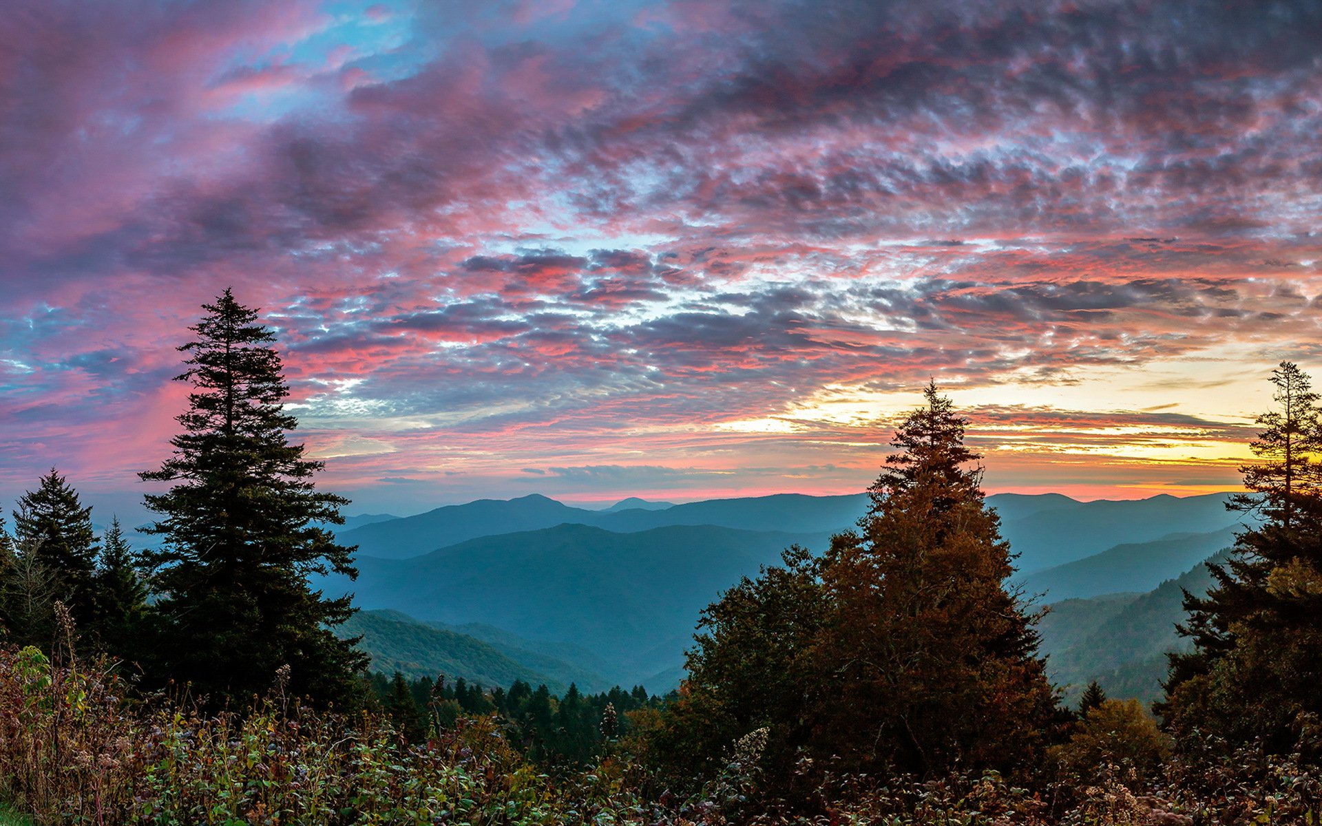 Paysage de montagne de forêt au coucher du soleil - fond d'écran de téléphone