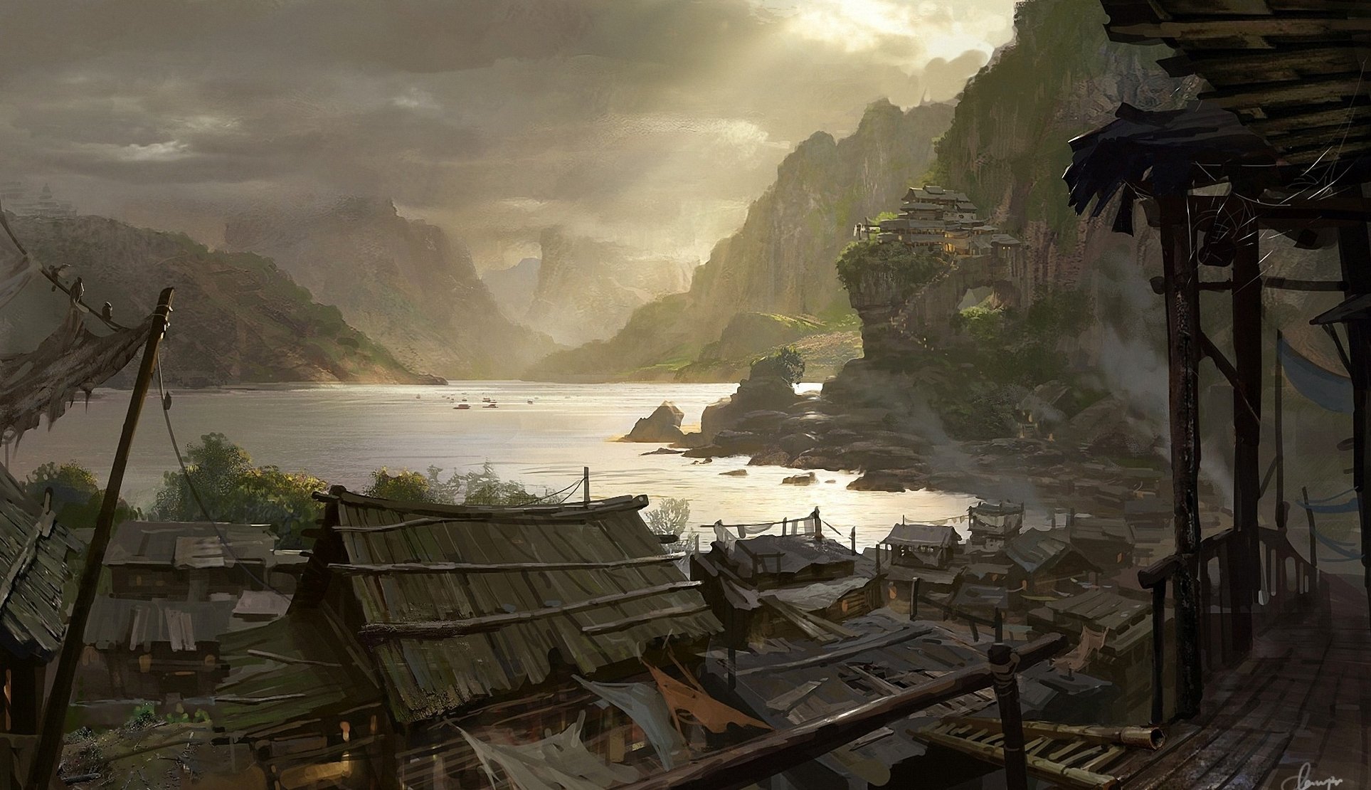 Tags:art, paysage peint, pont, village, maisons, rivière, montagnes