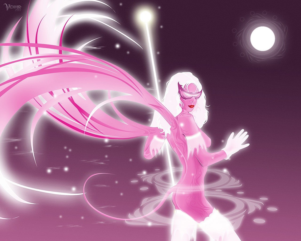 Fille de l'anime sur le fond de la lune dans un manteau flottant rouge sur un corps presque nuFille de l'anime sur le fond de la lune dans un manteau flottant rouge sur un corps presque nu