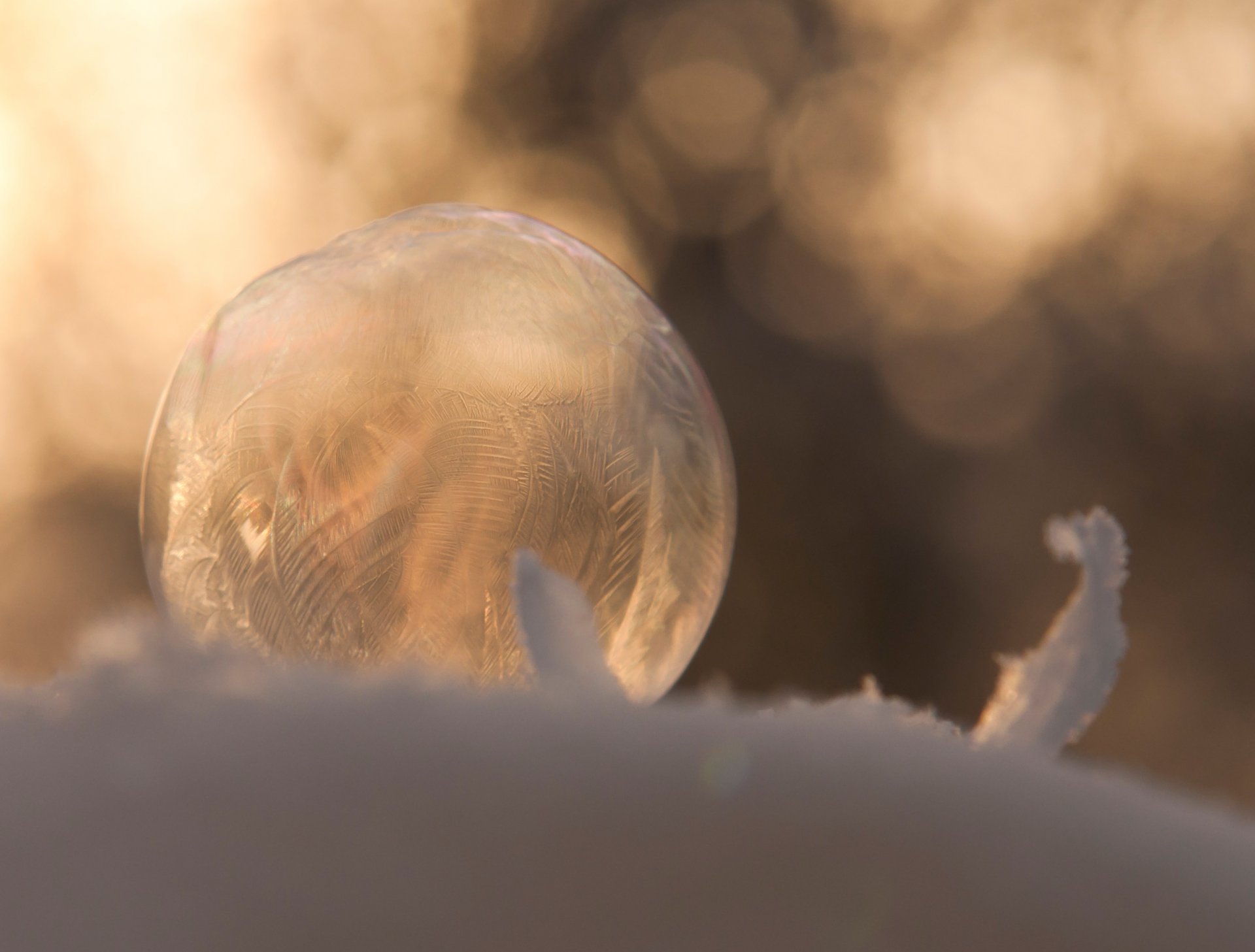 Gros plan d'un motif sur une bulle de savon gelée en hiverGros plan d'un motif sur une bulle de savon gelée en hiver