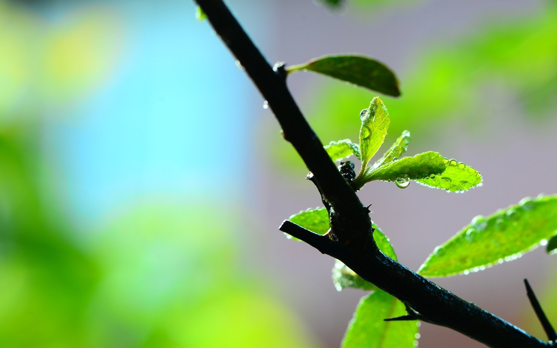Feuilles vertes sur une branche avec des gouttes de rosée en gros plan sur fond flouFeuilles vertes sur une branche avec des gouttes de rosée en gros plan sur fond flou