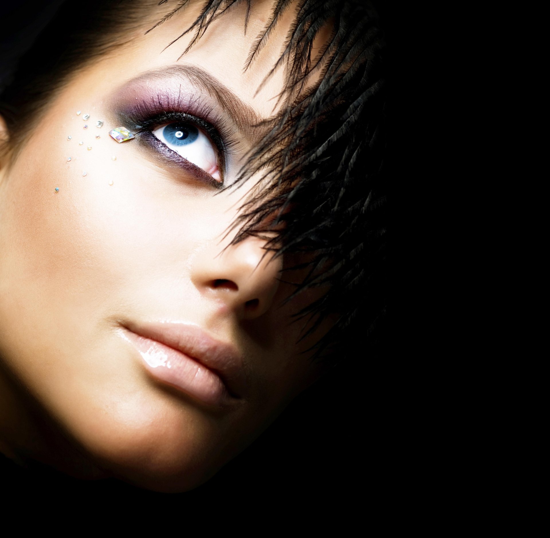 Tags:fille, fond noir, oeil, plumes, strass, maquillage