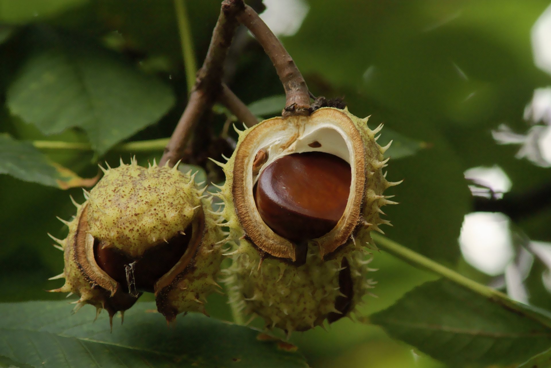 Châtaignes mûres sur une branche parmi le feuillage