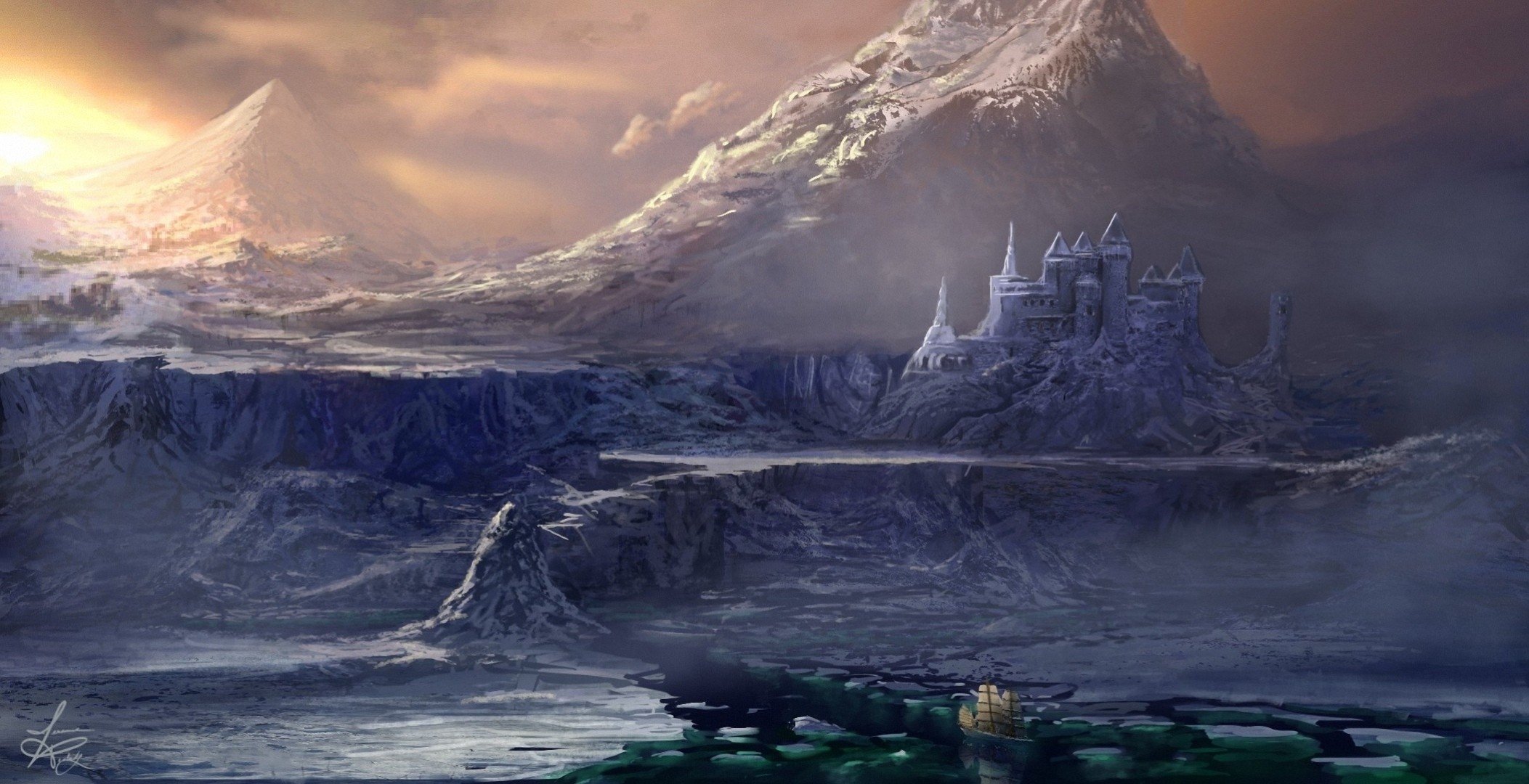Navires de feu au coucher du soleil