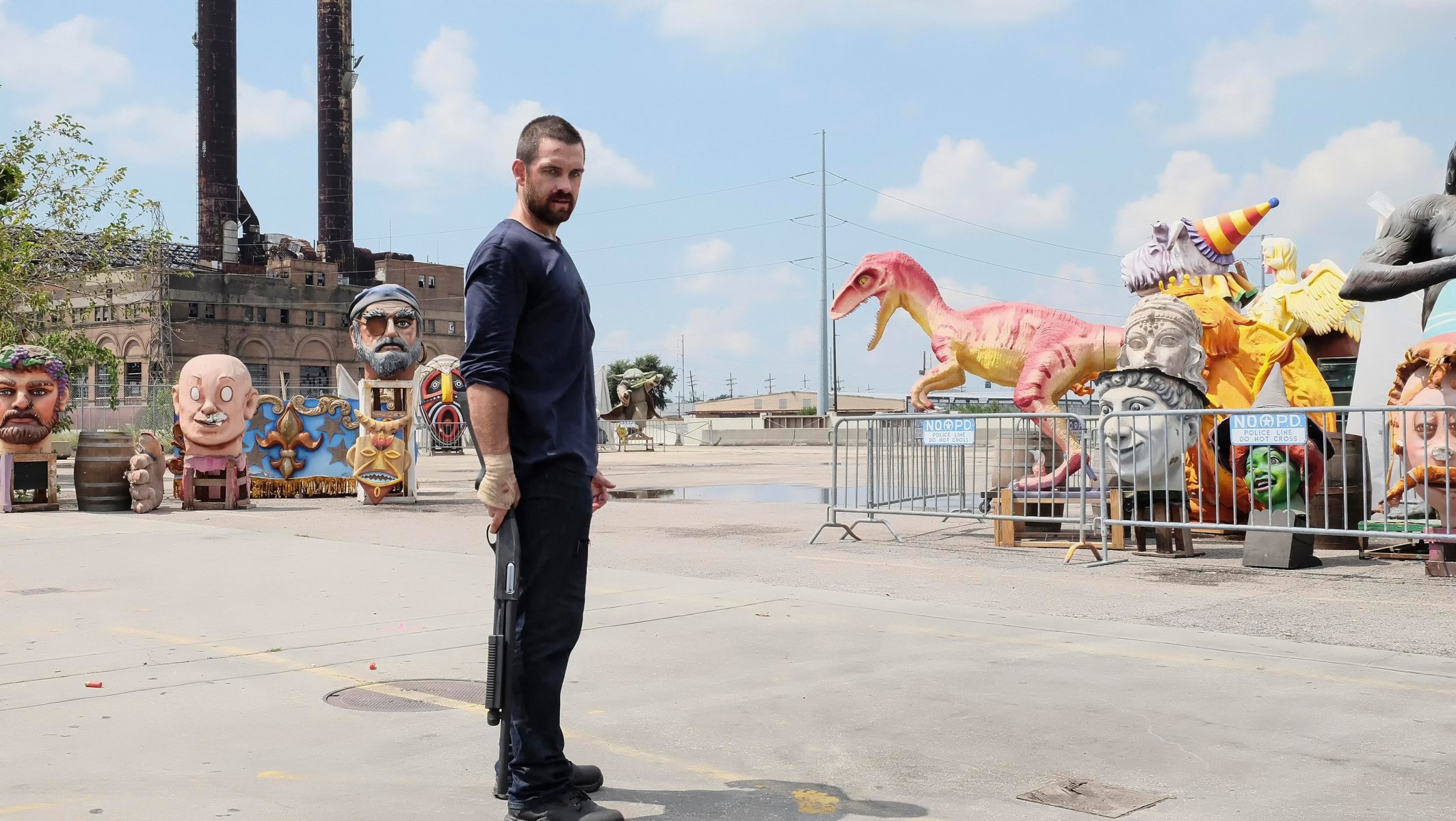 Anthony starr avec des armes sur une attraction pour enfantsAnthony Starr avec des armes sur une attraction pour enfants