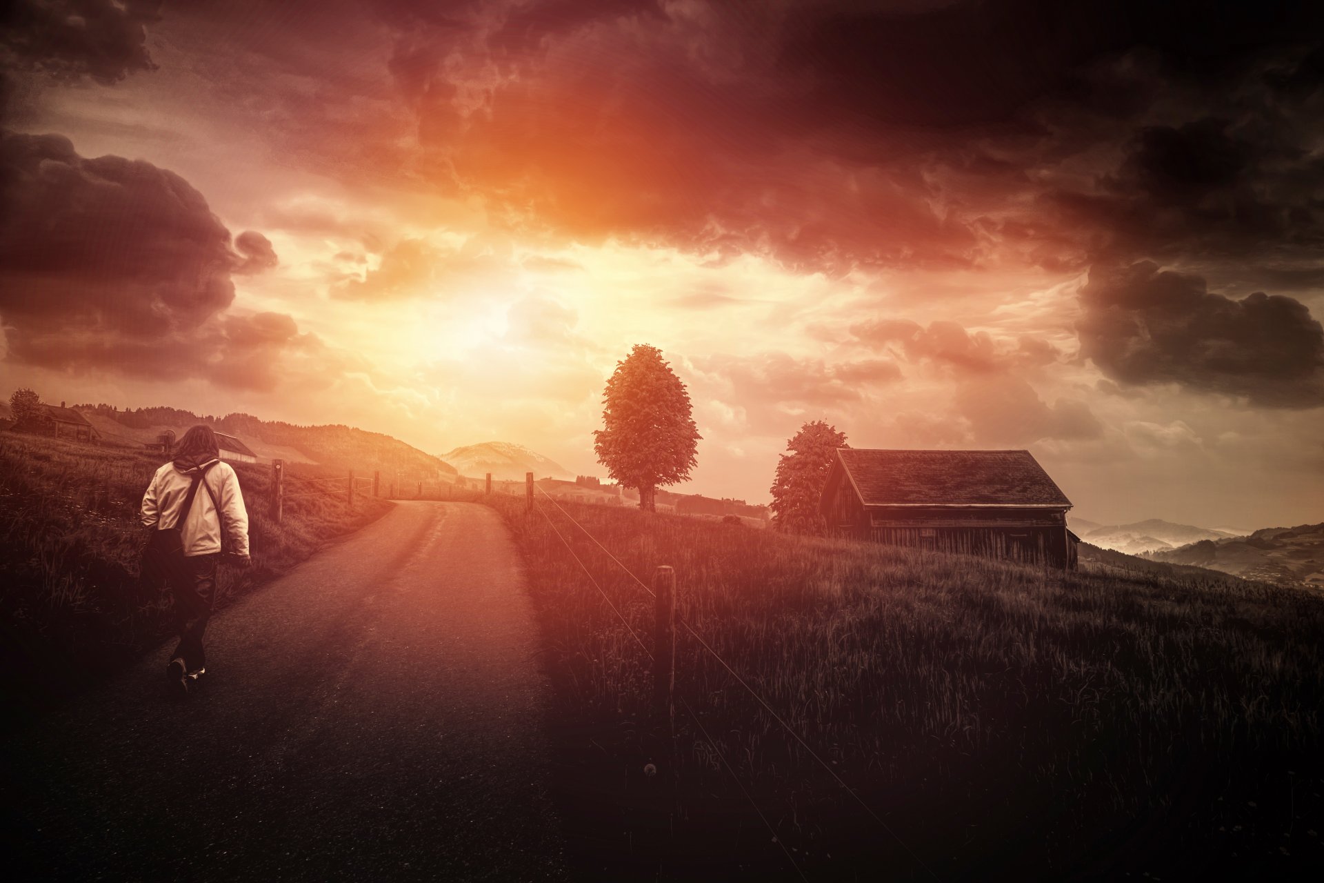 L'arbre près de la route. La route mène dans les nuages