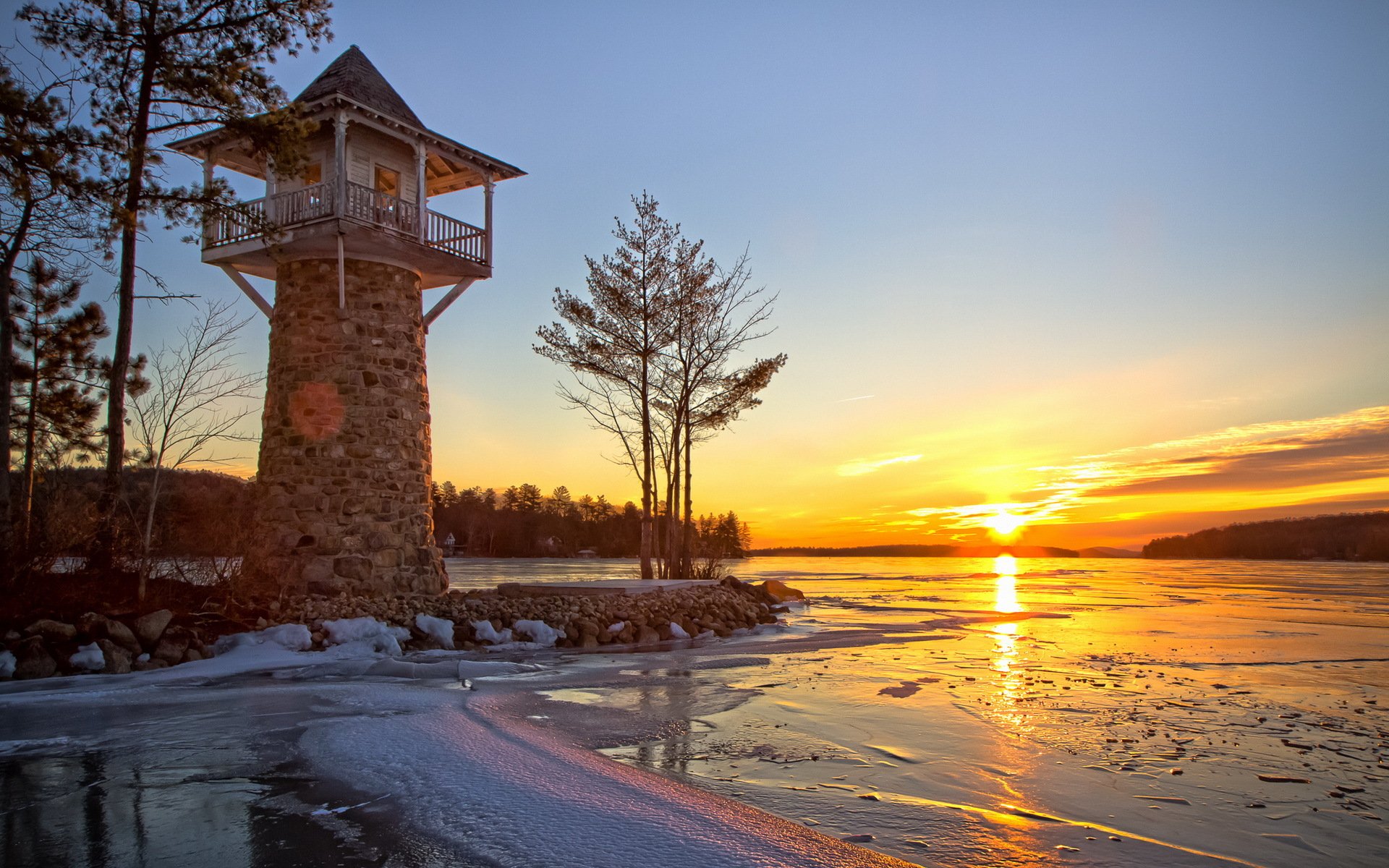 Plate-forme d'observation au coucher du soleil au bord du lacPlate-forme d'observation au coucher du soleil au bord du lac