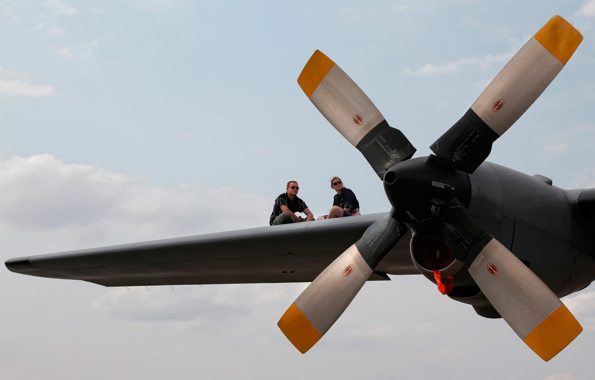 Deux personnes assises haut dans le ciel sur une aile d'avionDeux personnes assises haut dans le ciel sur une aile d'avion