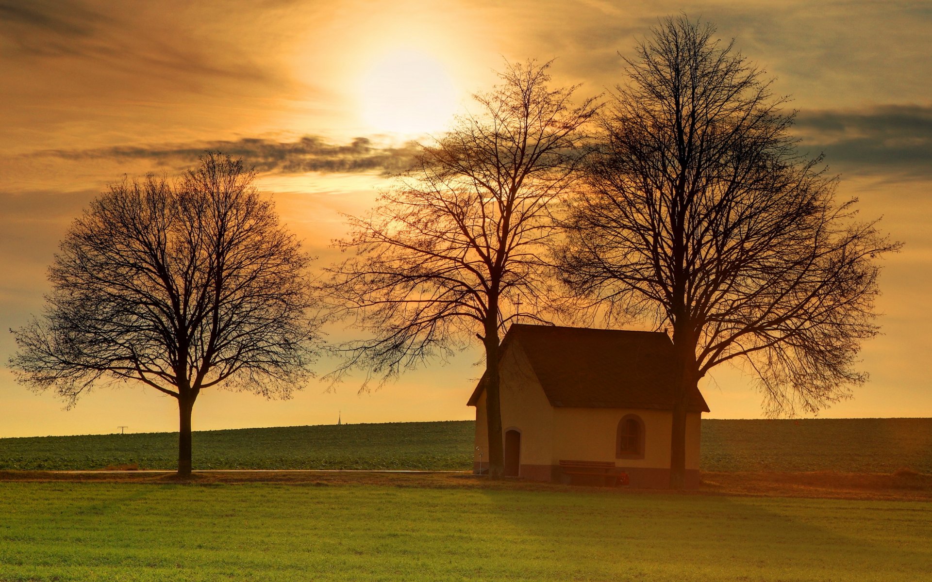 Arbres et maison dans le champ. beau coucher de soleilArbres et maison dans le champ. Beau coucher de soleil