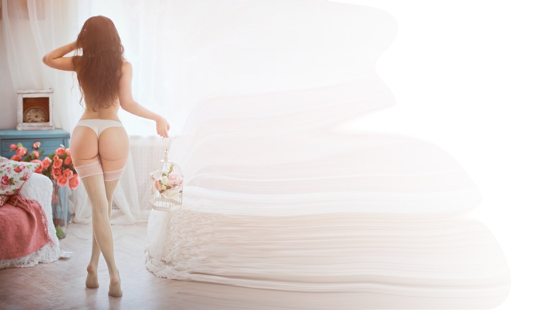 Fille en bas avec de longues jambes, beau cul et culotte, tenant un bouquet de fleurs