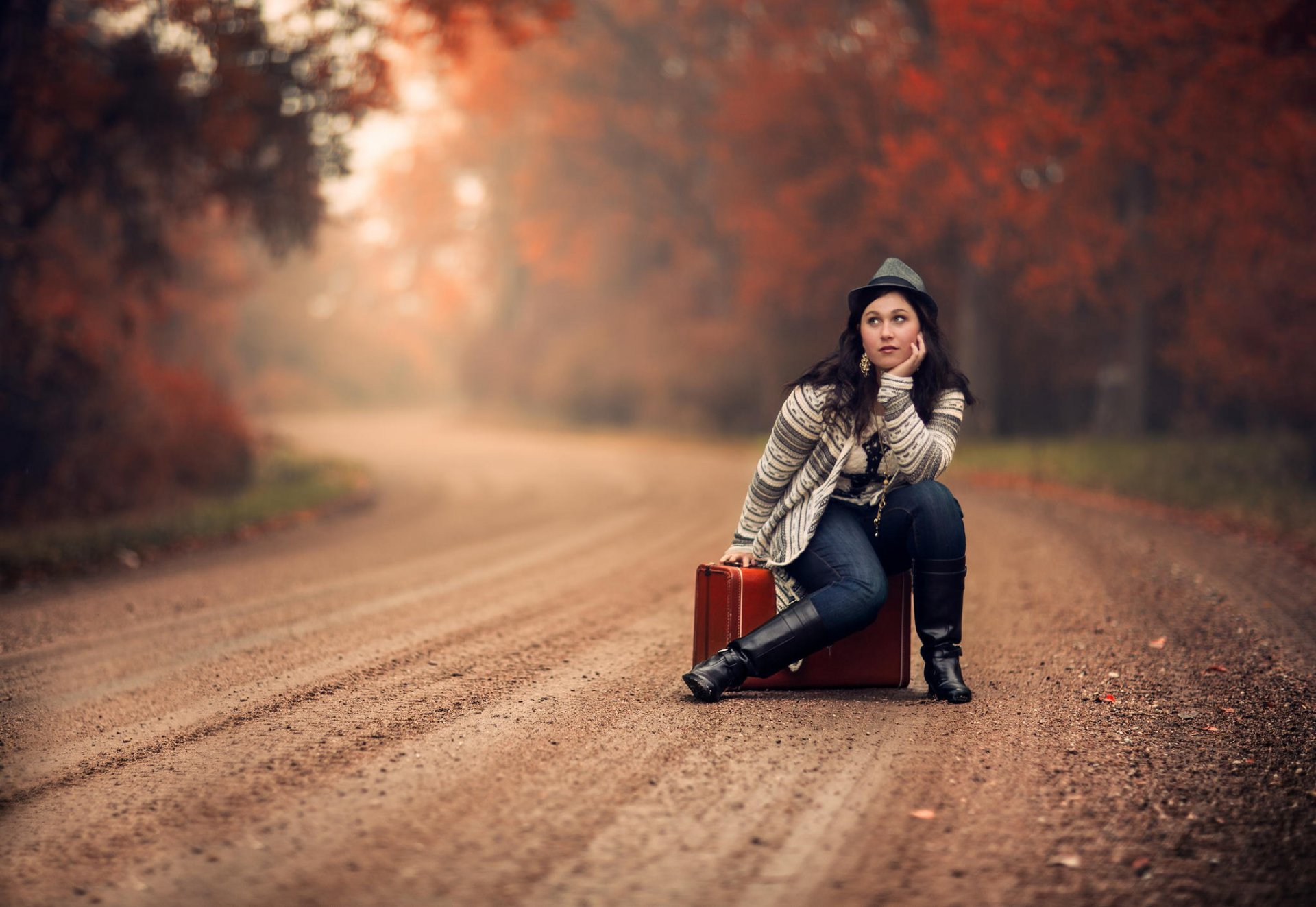 Une jeune femme est assise sur une valise sur la route près de la forêtUne jeune femme est assise sur une valise sur la route près de la forêt