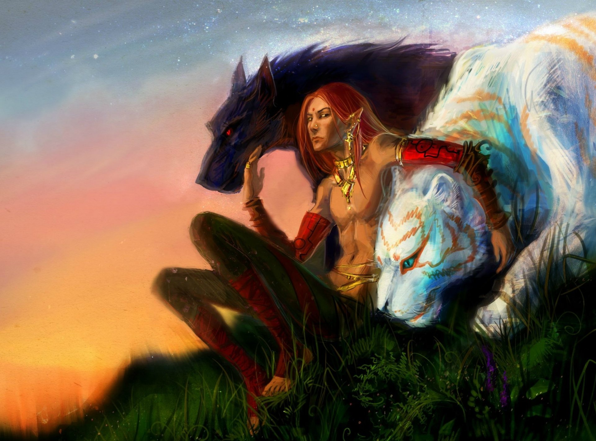 L'art de l'elfe accompagné de bêtes sous la forme d'un tigre blanc et d'un loup noir aux yeux rougesL'art de l'elfe accompagné de bêtes sous la forme d'un tigre blanc et d'un loup noir aux yeux rouges