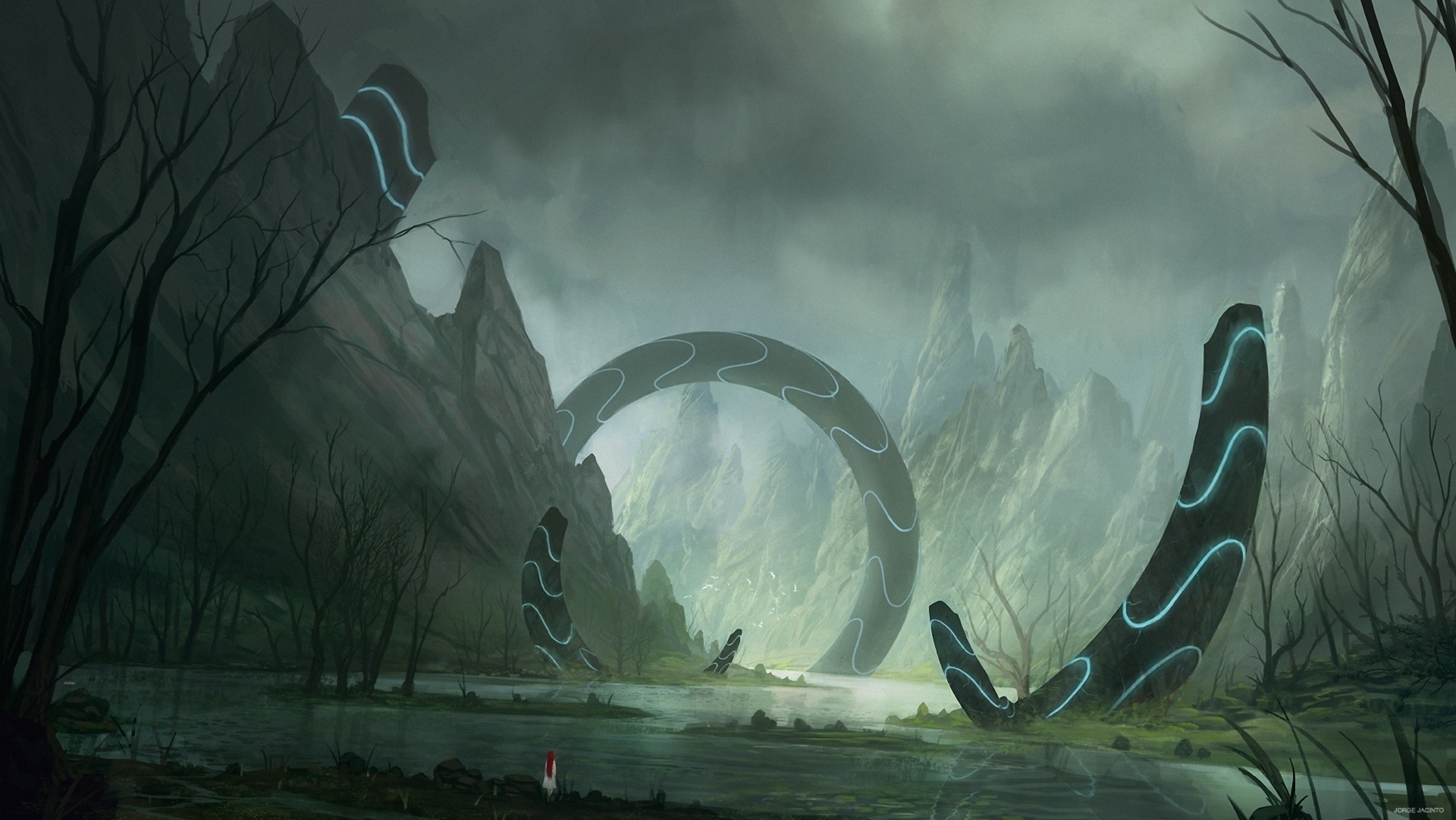 Paysage de ruines sur un fond sombre parmi les rochersPaysage de ruines sur un fond sombre parmi les rochers