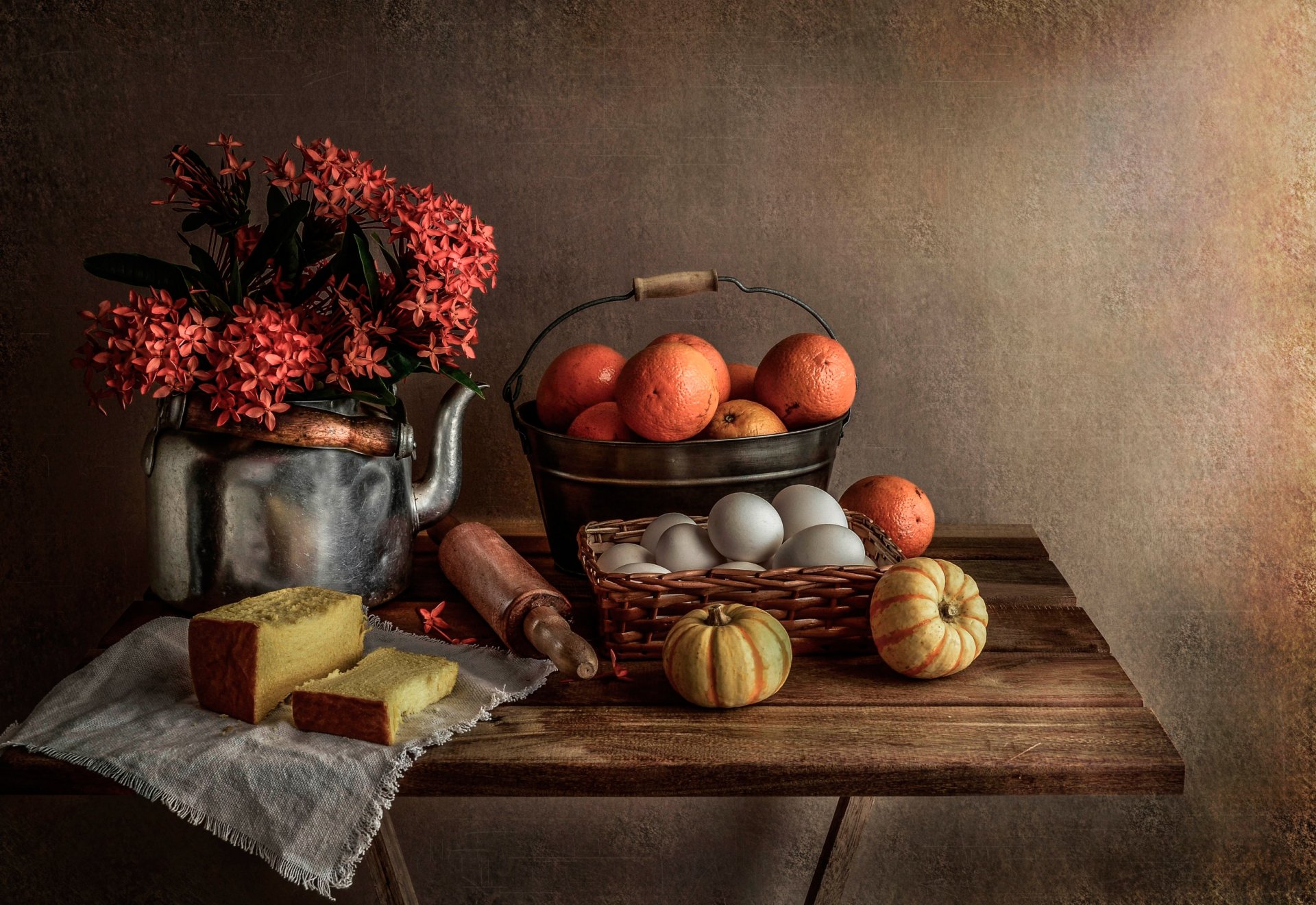Nature morte de fleurs dans une théière, pain, oranges et citrouilles