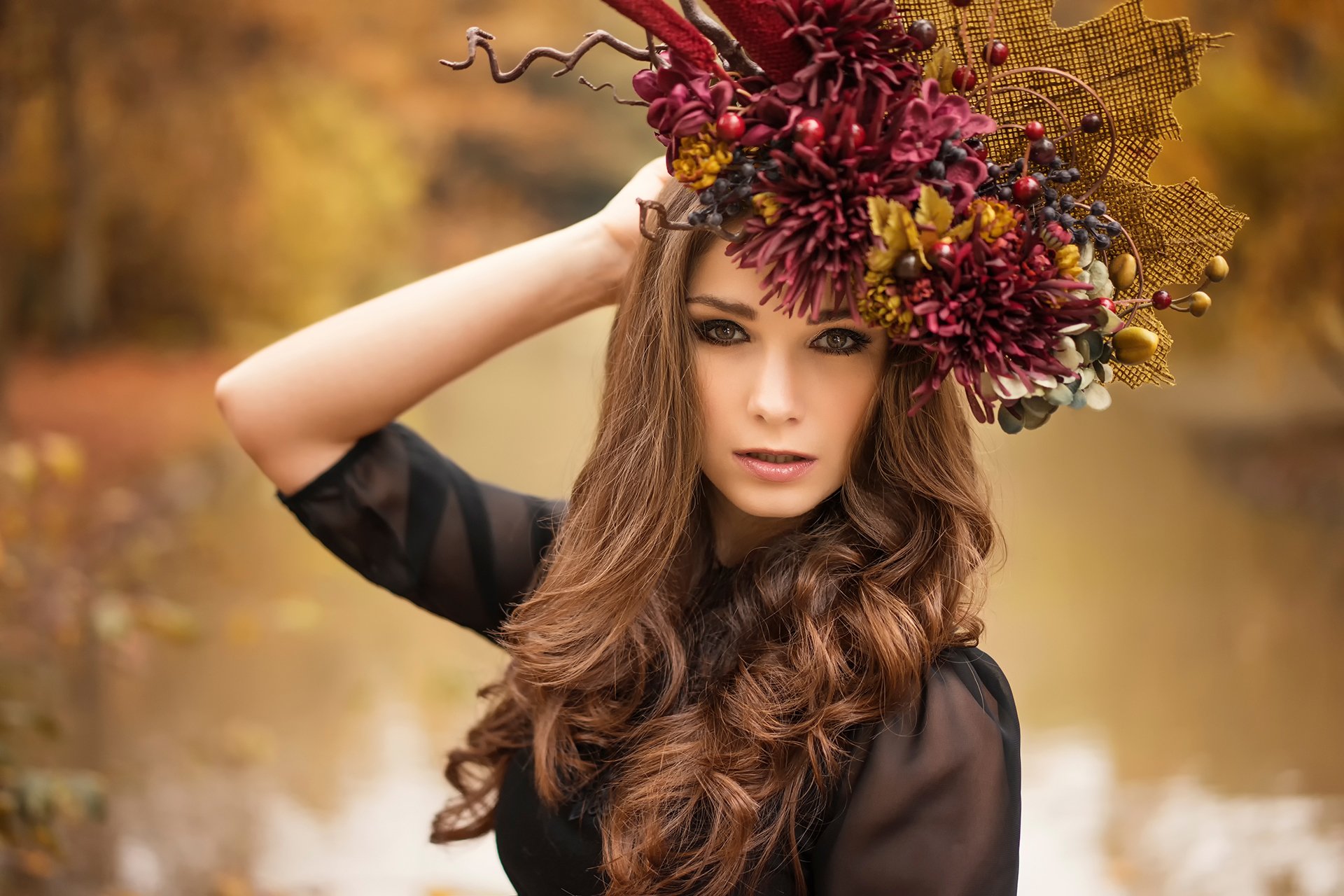 Fille blonde avec des yeux rouges et des arcs dans la forêt. Un mec au loin la regarde