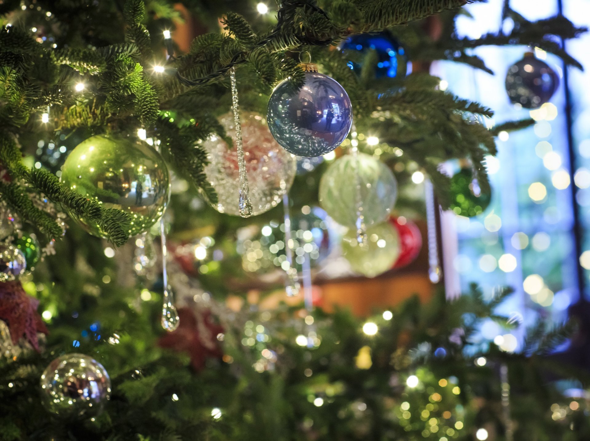 Boules de noël et glaçons sur une branche de sapin