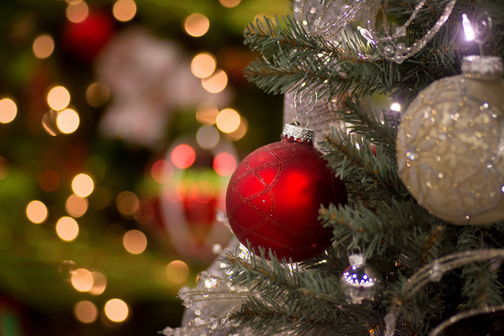 Deux boules d'arbre de Noël suspendus sur un arbre de Noël sur un fond de lumières