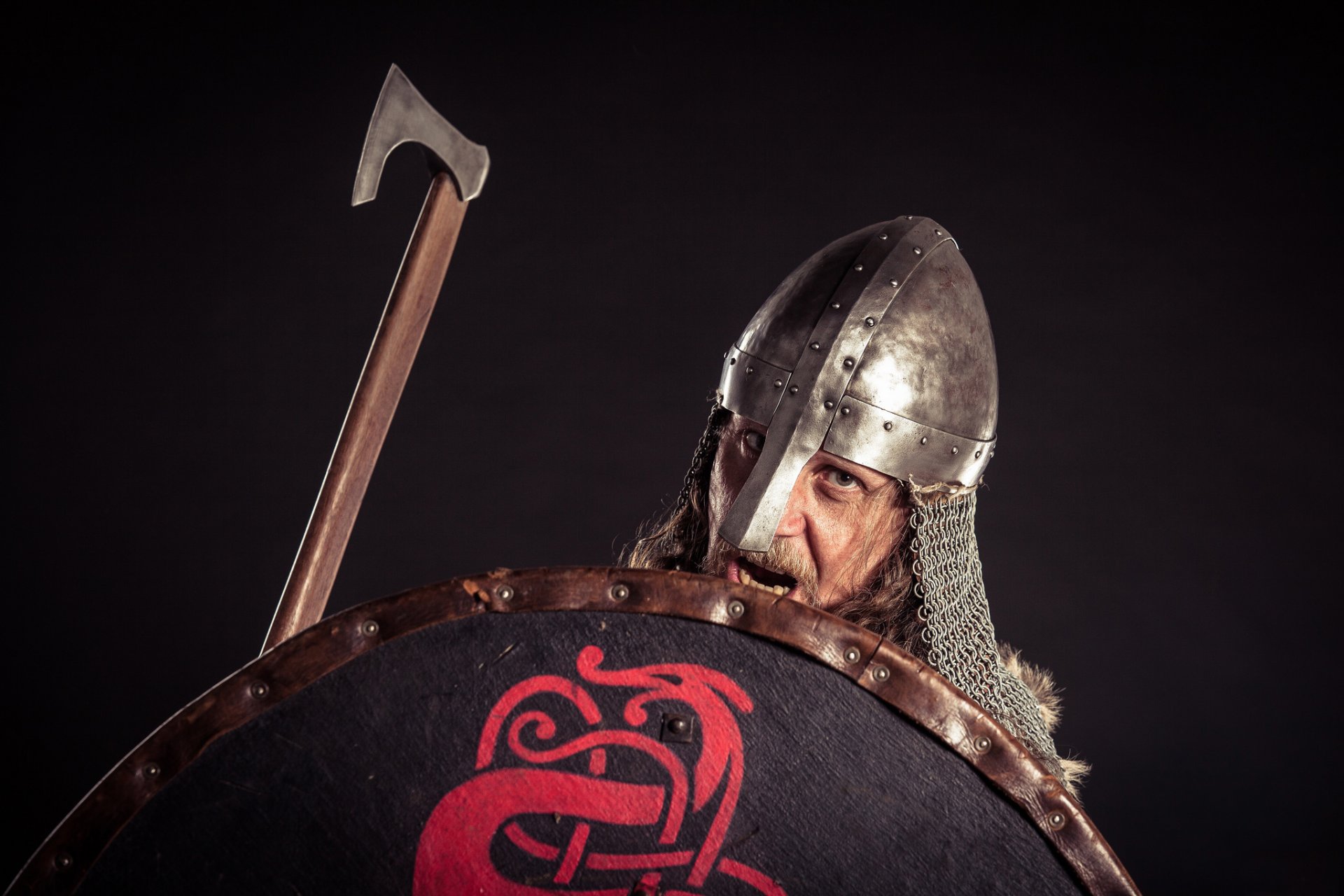 Guerrier portant un casque avec un bouclier et une hacheGuerrier portant un casque avec un bouclier et une hache
