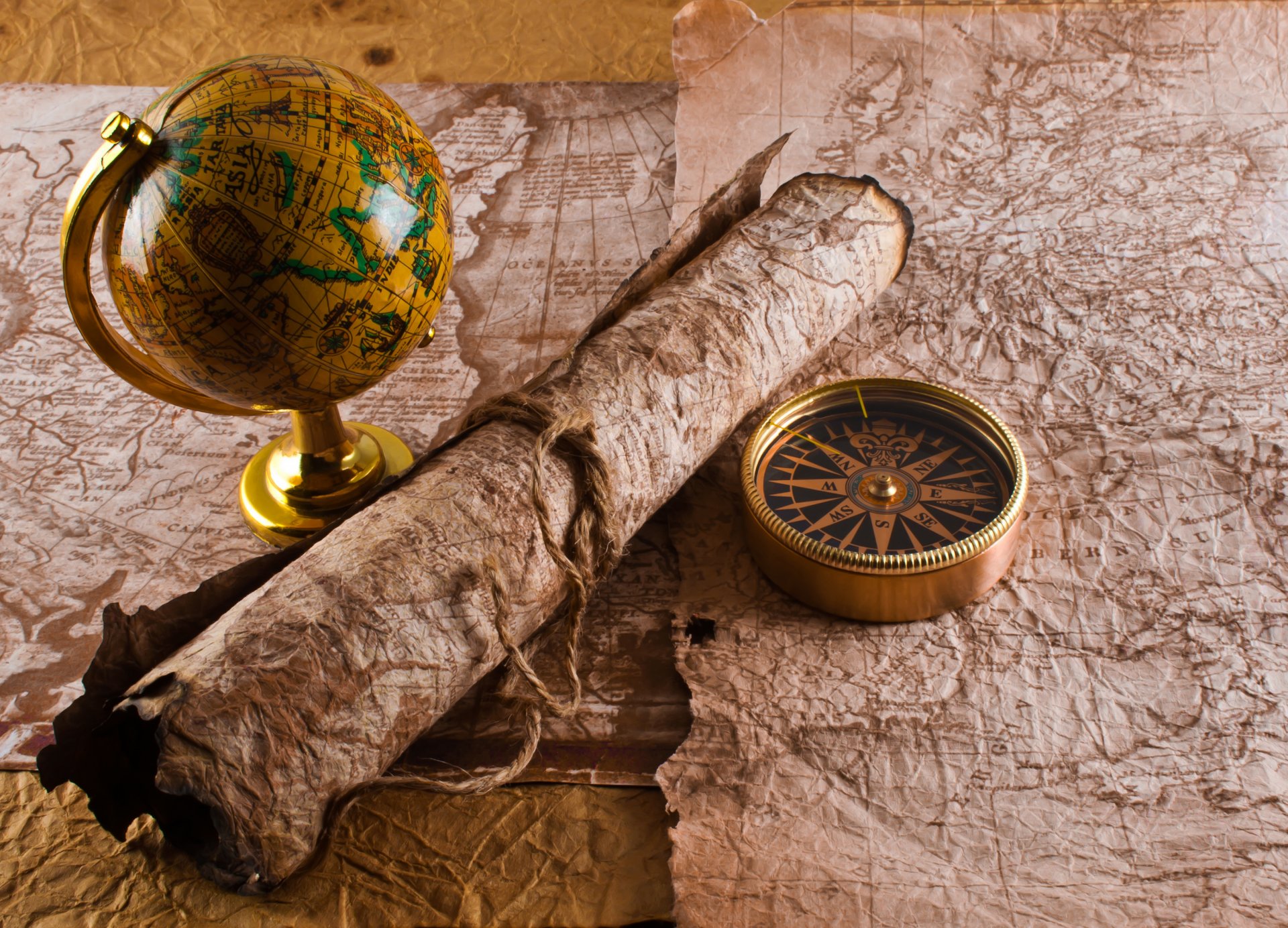 Un vieux manuscrit roulé par un rouleau se trouve à côté de la boussoleUn vieux manuscrit roulé par un rouleau se trouve à côté de la boussole