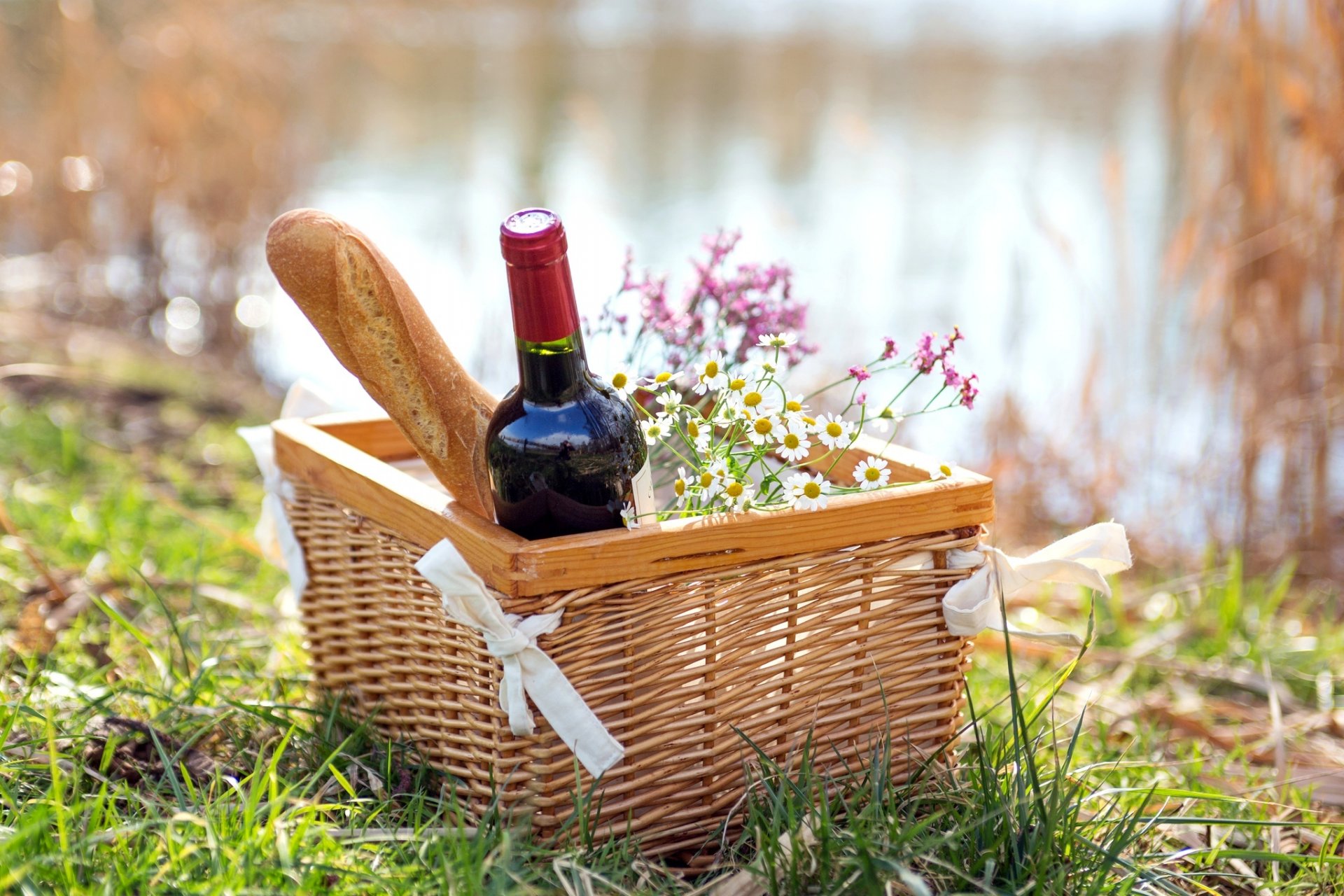 Panier de pique-nique avec vin et baguette sur le rivage