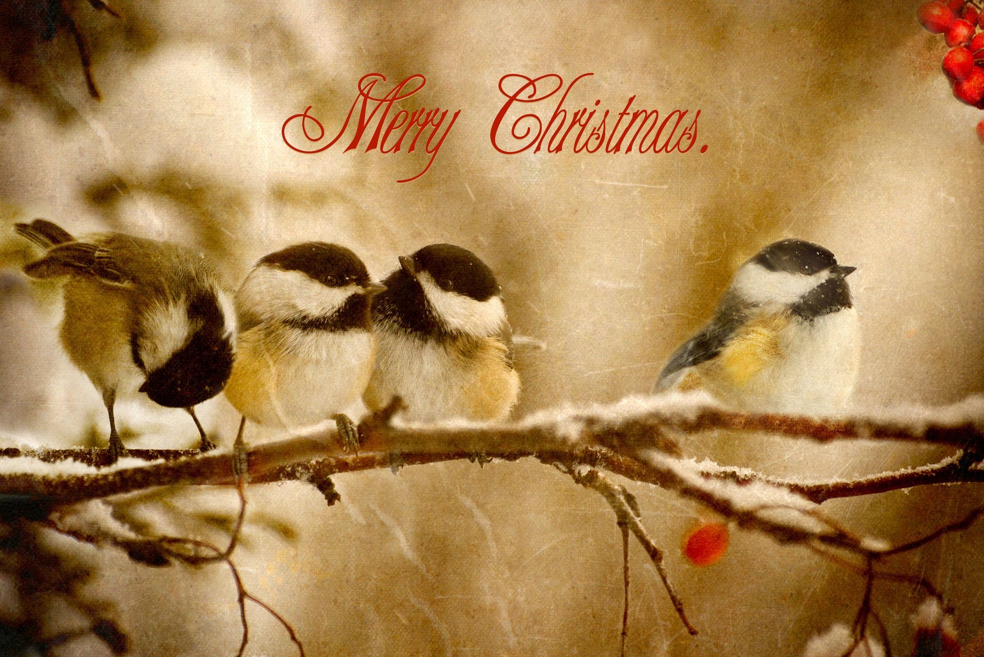 Quatre mésanges sur une branche avec des baies rouges