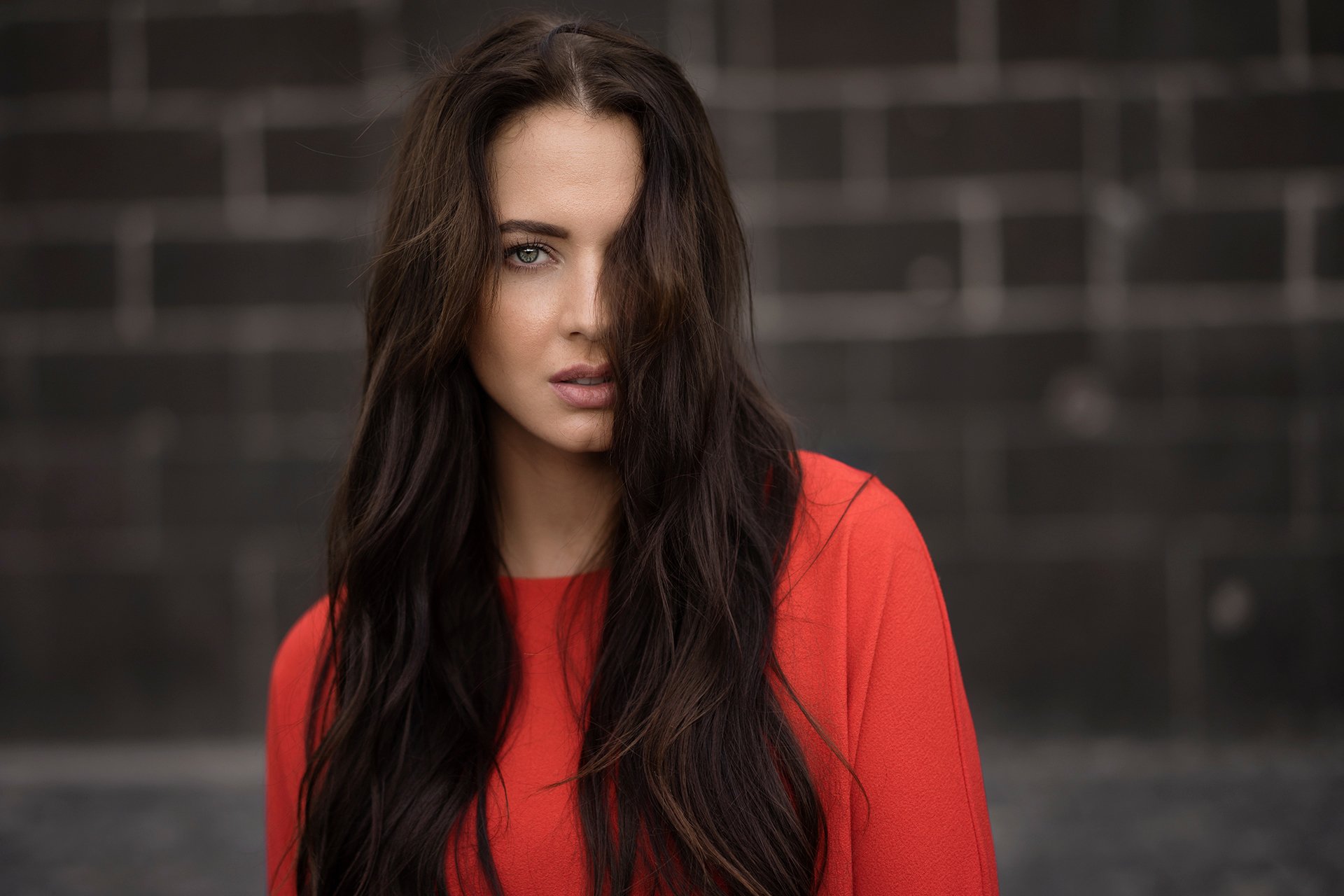 Fille aux yeux bruns avec des boucles d'oreilles en métal lèche les lèvres rougesFille aux yeux bruns avec des boucles d'oreilles en métal lèche les lèvres rouges