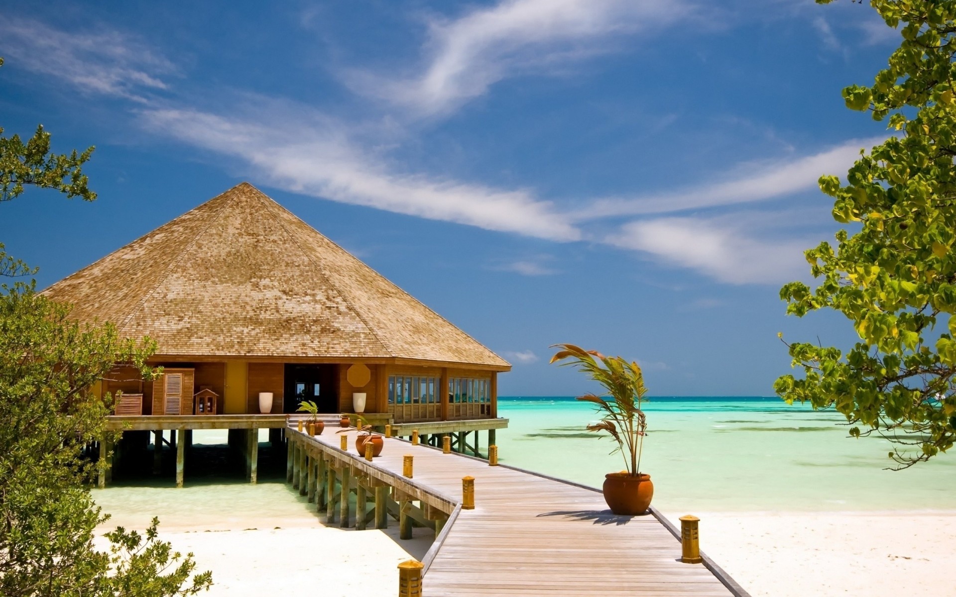 Plage de sable blanc et bungalow dans la mer bleuePlage de sable blanc et bungalow dans la mer bleue