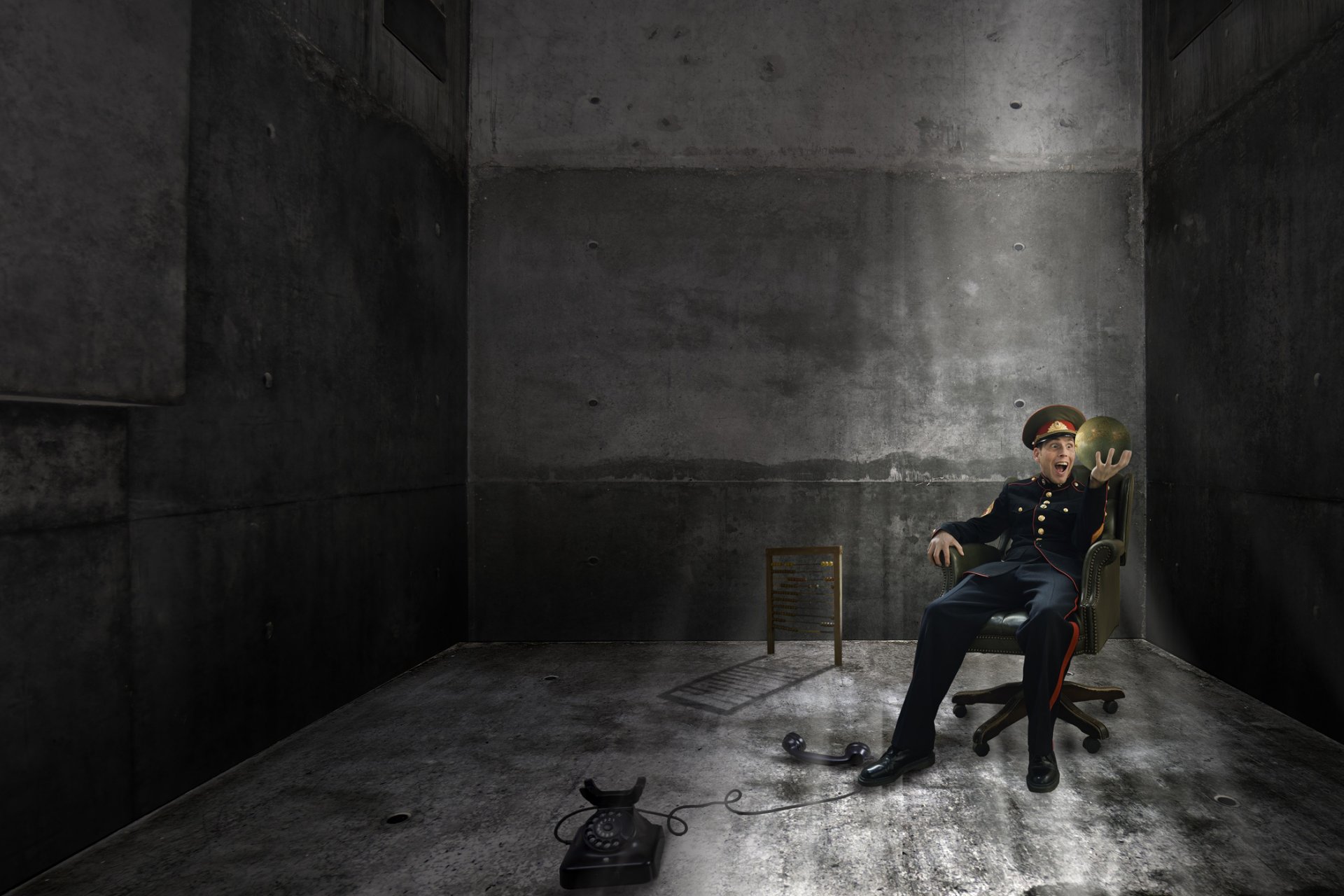 Un policier sur une chaise de bureau avec le noir d'un téléphone dans un bunker