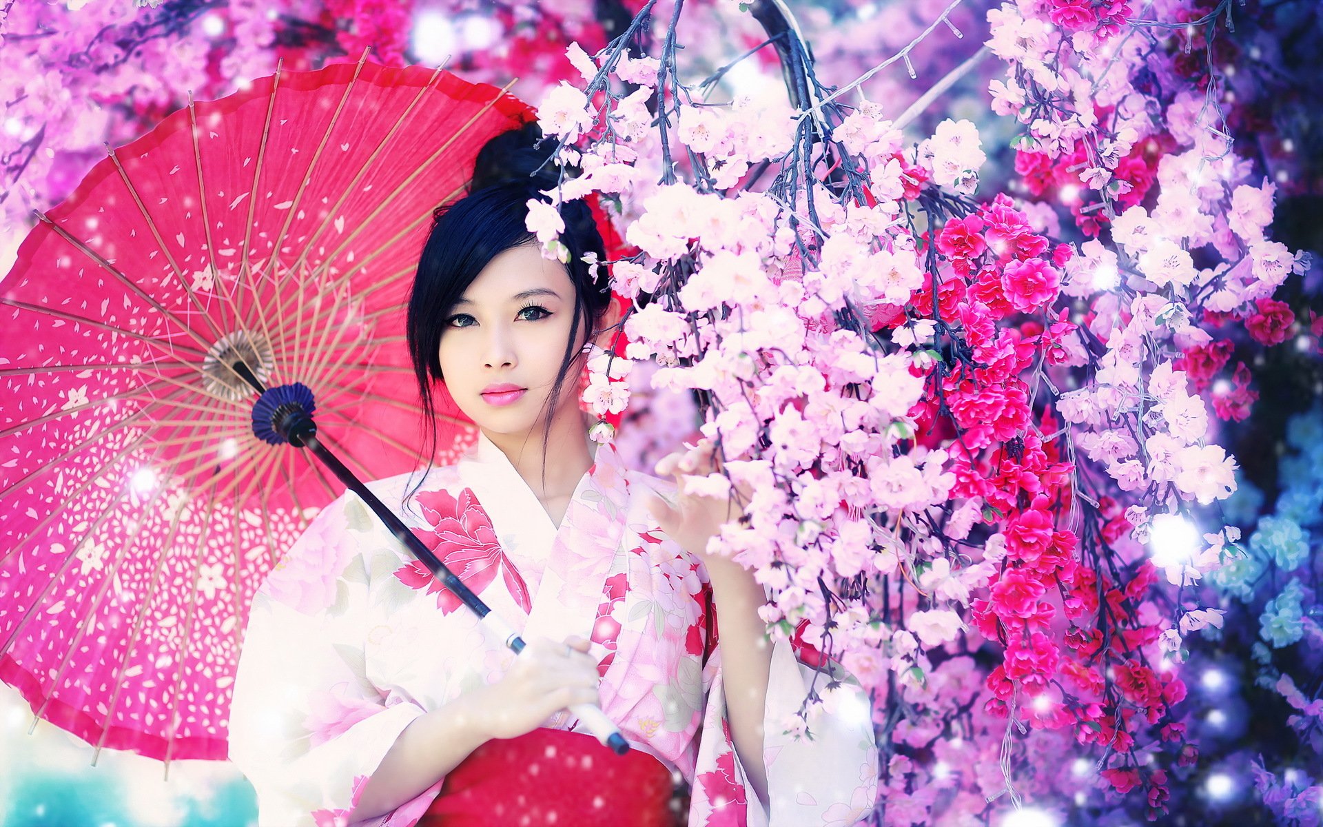 Fille asiatique sur fond de sakura avec parapluie roseFille asiatique sur fond de Sakura avec parapluie rose