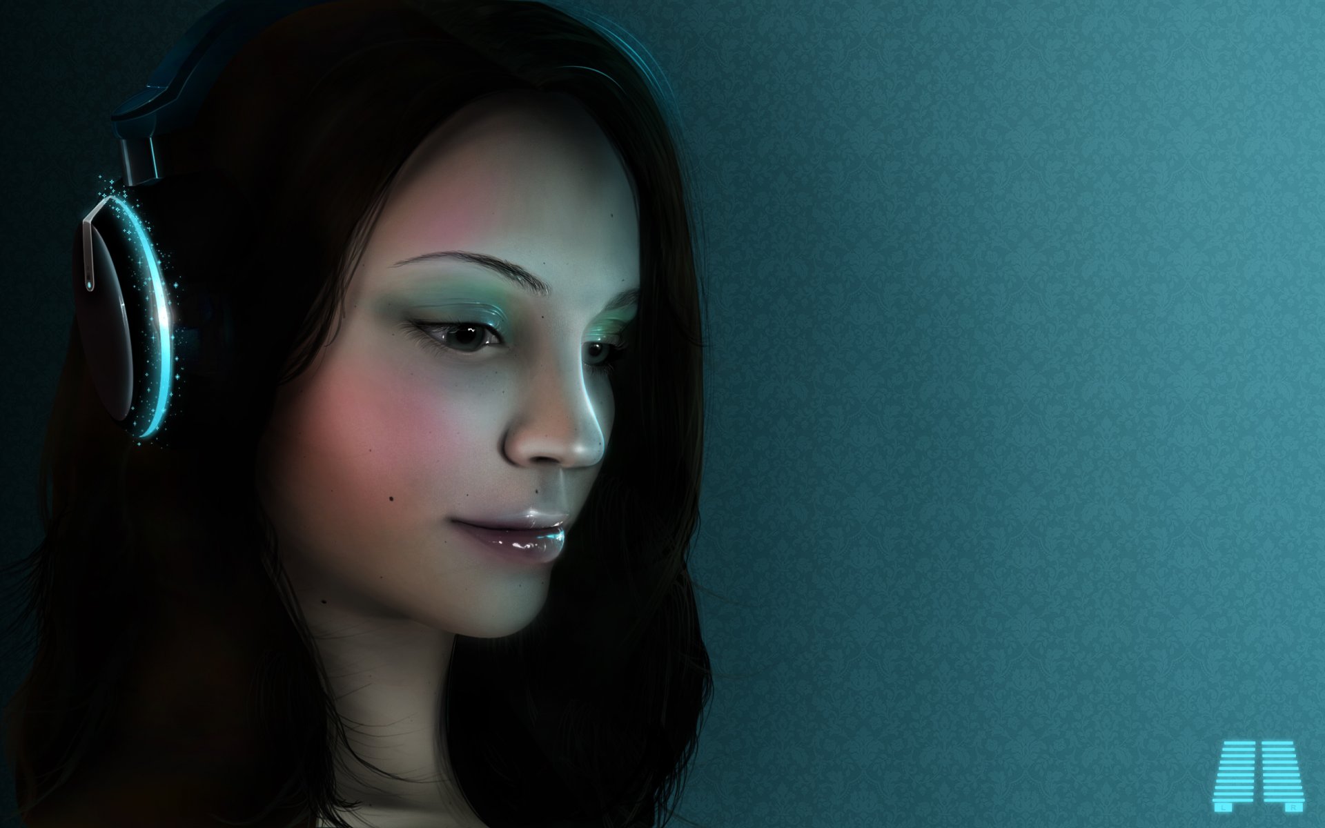 Jeune fille brune dans un casque voit son reflet sous la forme de notesJeune fille brune dans un casque voit son reflet sous la forme de notes