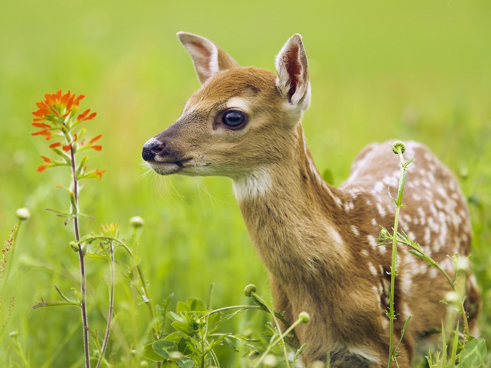 Cerf dans l'herbe en regardant la fleur