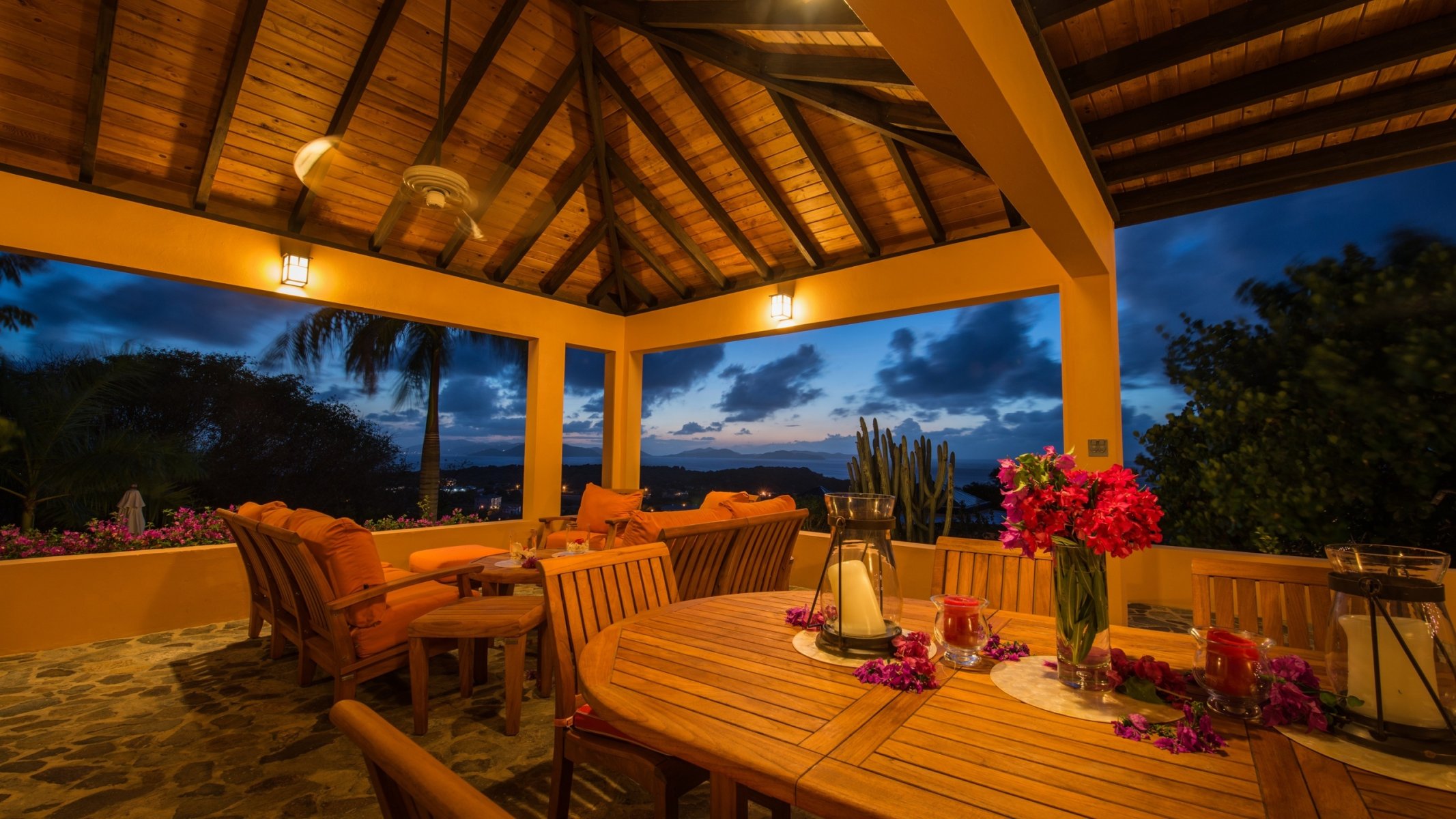 Pergola en bois couverte au bord de l'océan à la lumière des lanternesPergola en bois couverte au bord de l'océan à la lumière des lanternes