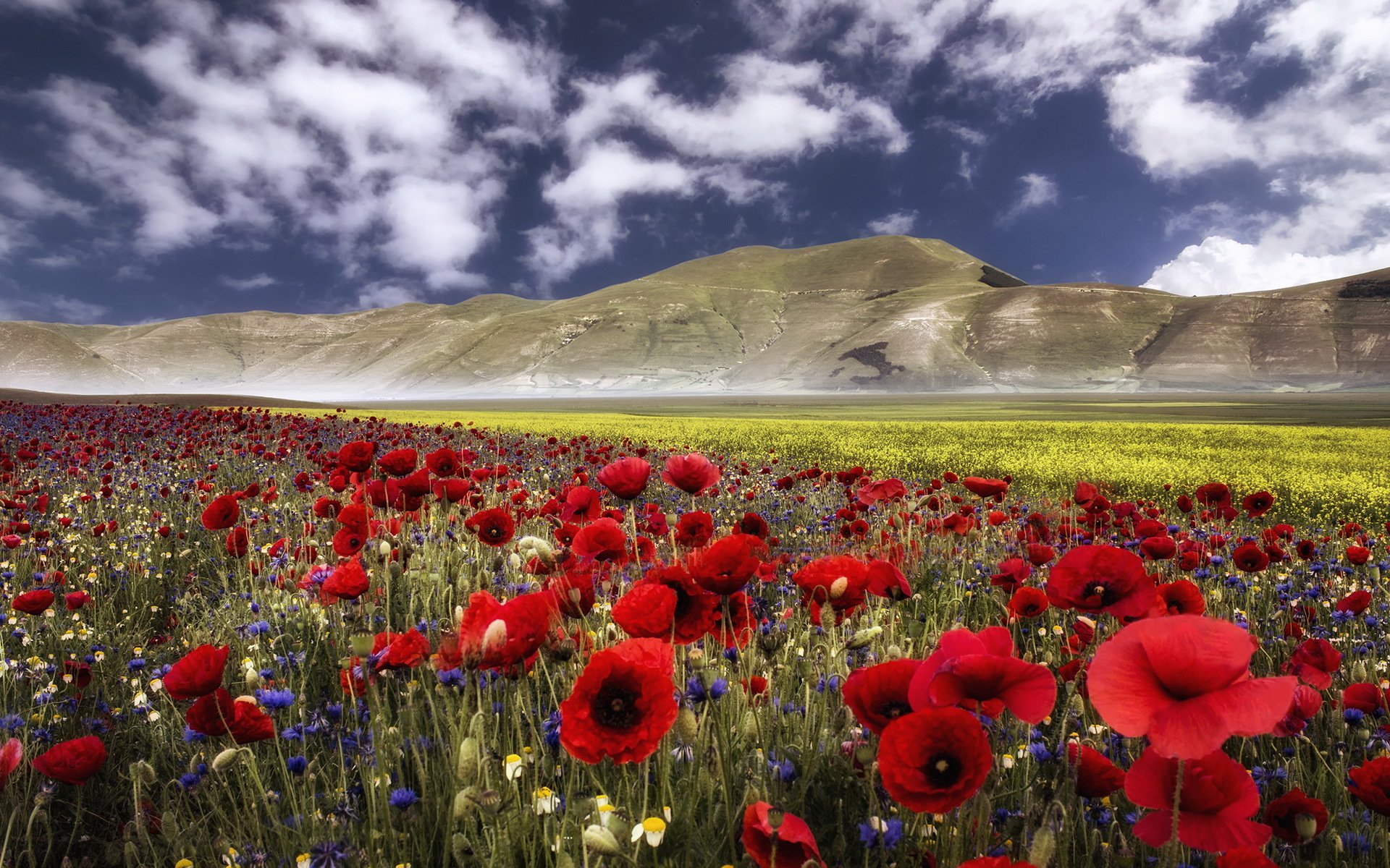 Italie. castelluco di Norcia. champ de coquelicots dans les montagnes